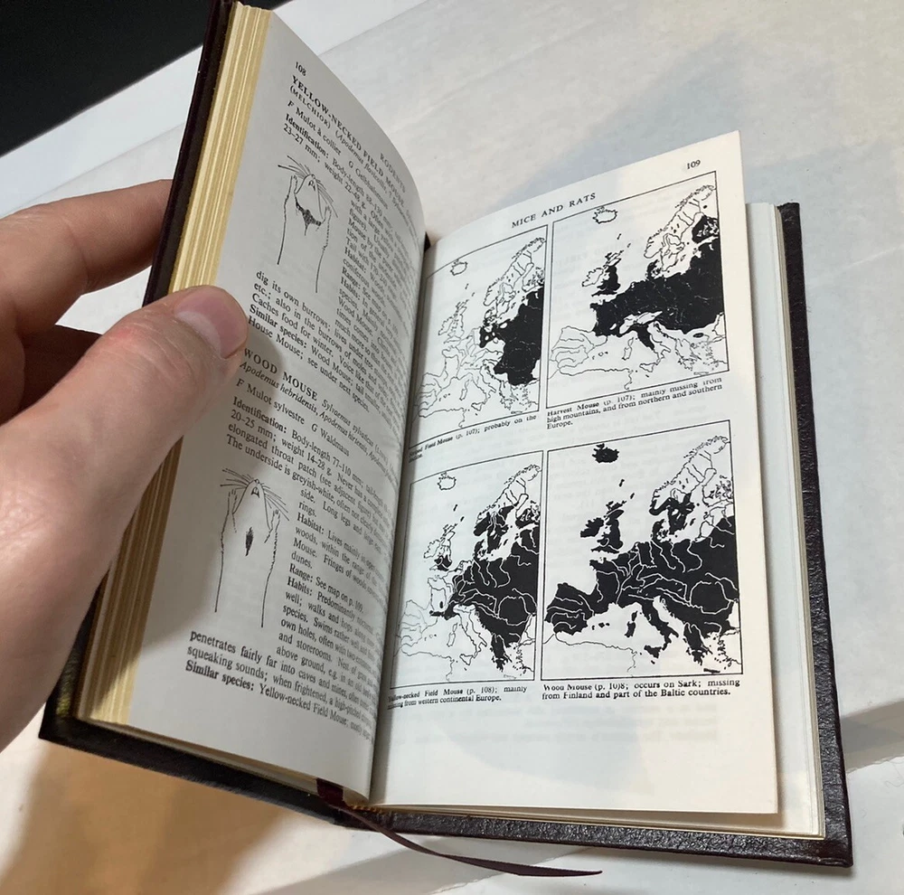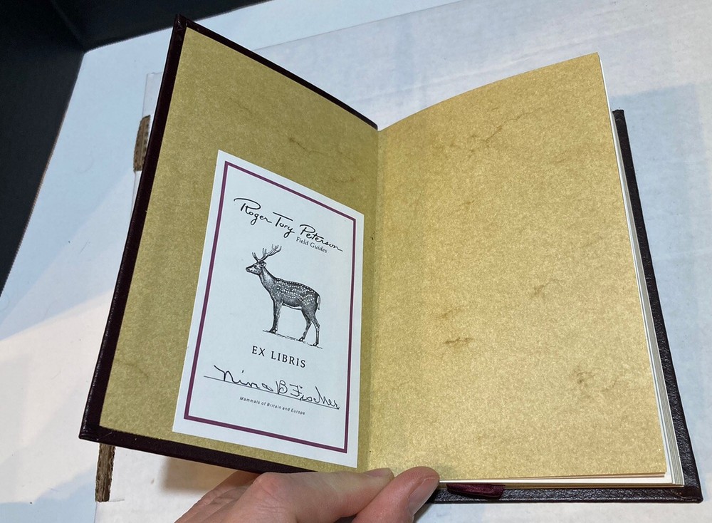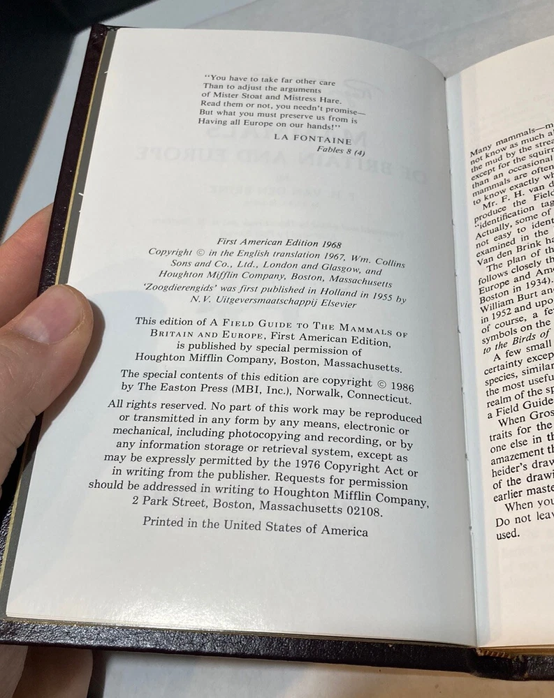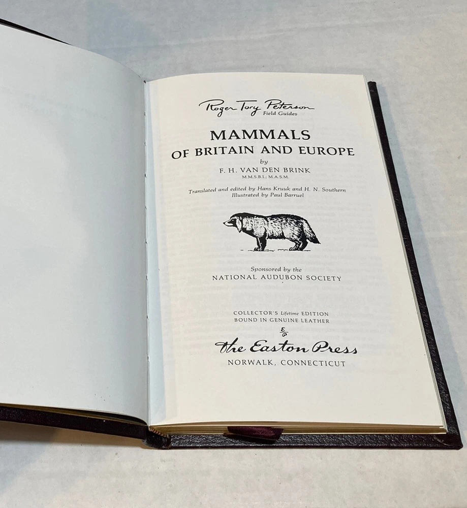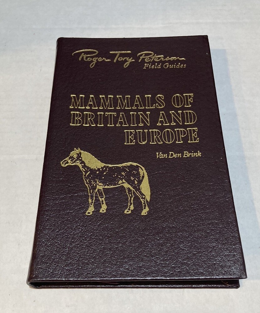 Up for sale is a beautiful 1986 Easton Press Edition copy of "ROGER TORY PETERSON FIELD GUIDES: MAMMALS OF BRITAIN AND EUROPE" by Van Den Brink. Gold Gilding to the boards and along the spine as well as gilded page ends. A beautiful copy of this classic field guide. Find what you're looking for with Peterson Field Guides —their field-tested visual identification system is designed to help you differentiate thousands of unique species accurately every time. Detailed descriptions of mammal orders, families, and many individual species are illustrated with 1,300 drawings and 142 superb color paintings. Illustrations - which use the unique Peterson Identification System to distinguish one mammal from another - include size lines to show the size of each animal. A helpful glossary explains the technical terms of mammal anatomy. This book is in very good condition. Boards are clean with four good corners. A little curl to the front board, which should fix itself with proper shelving. Some rubbing/chipping/shelf wear around the edges of the boards. Internally the book is in excellent condition. Spine and pages are extremely tight. Previous owner's bookplate on the front pastedown. No other marks, book plates, tears, or writing anywhere in this book. Please review all photos for your best idea of the condition. Shipping on this item will be $5.88.