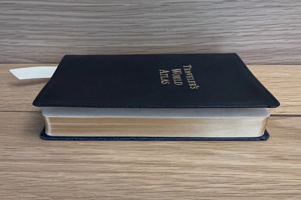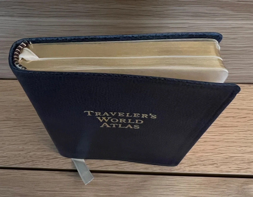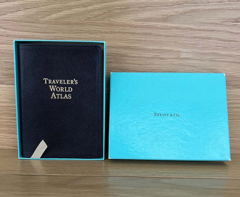 Tiffany & Co. Traveler’s World Atlas, Leather, Gold Gilded, 1997 w/ Box. Box measures roughly 5 inches x 7 inches.