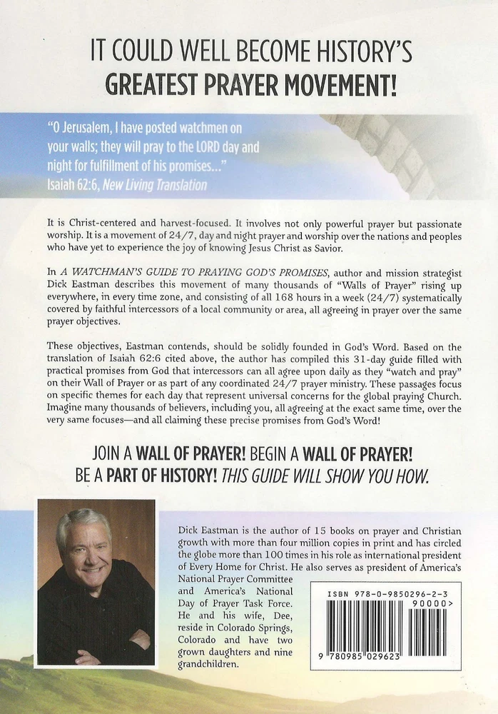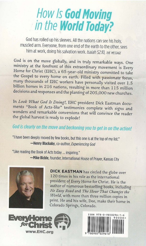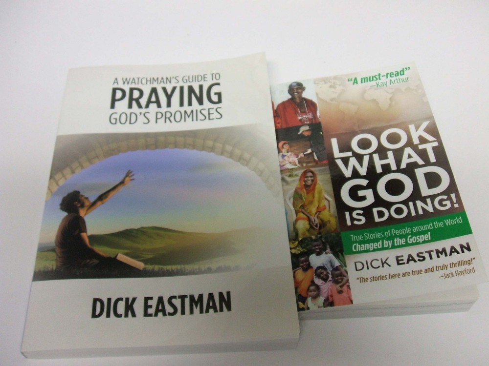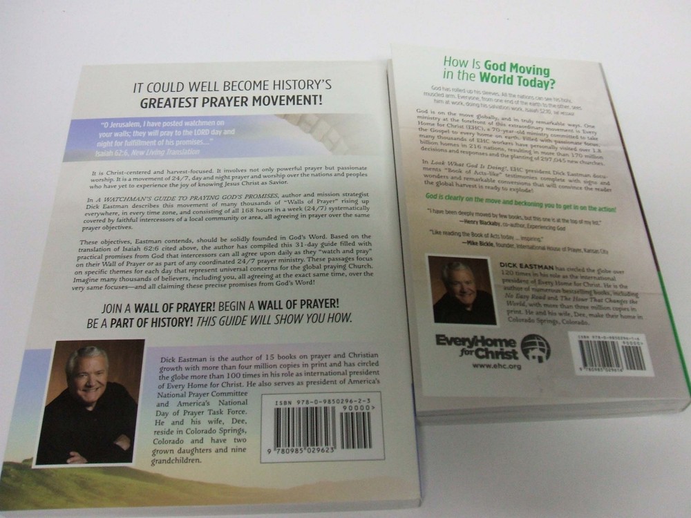 2 Book Set: BRAND NEW Look What God is Doing! (2012)- Dick Eastman - 235 pages Dick Eastman has traveled the world forty times over as president of Every Home for Christ, a ministry that uses home-to-home literature distribution to spread the gospel. Currently EHC has planted more than 2.6 billion gospel messages in 198 nations. Now Dick shares some of the powerful testimonies resulting from that work over the last 62 years. These remarkable stories--from the jungles of Brazil to the foothills of the Himalayas--will amaze and spur the faith of believers everywhere, helping them see that, as Dick says, "Finishing the task of the Great Commission, in our neighborhoods and throughout the earth, is really quite simple--and on its way to fulfillment. A Watchman's Guide to Praying God's Promises - Dick Eastman - 2015 - NEW A Watchman's Guide to Praying God's Promises Author: Dick Eastman 2015 Paperback - 219 pages ISBN 978-0-9850296-2-3 Written by Dick Eastman, this 31-day prayer guide is filled with practical promises from God that intercessors can all agree upon daily as they “watch and pray.” From a smoke free home. No pencil marks or highlights. Actual photos of the item you will receive, I do not use stock photos.