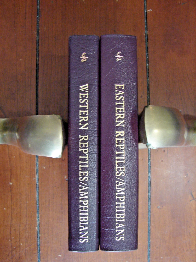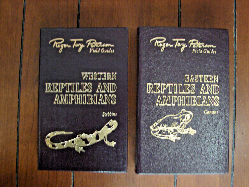 Two Easton Press leather bound volumes. 50th Anniversary editions of Roger Tory Peterson Field Guides, Eastern and Western Reptiles and Amphibians. Both volumes have the bookplate they were issued with mounted on the front end page, with the original owner's name written on them, which has been blacked out with marker. Otherwise the books are like new and likely never used.