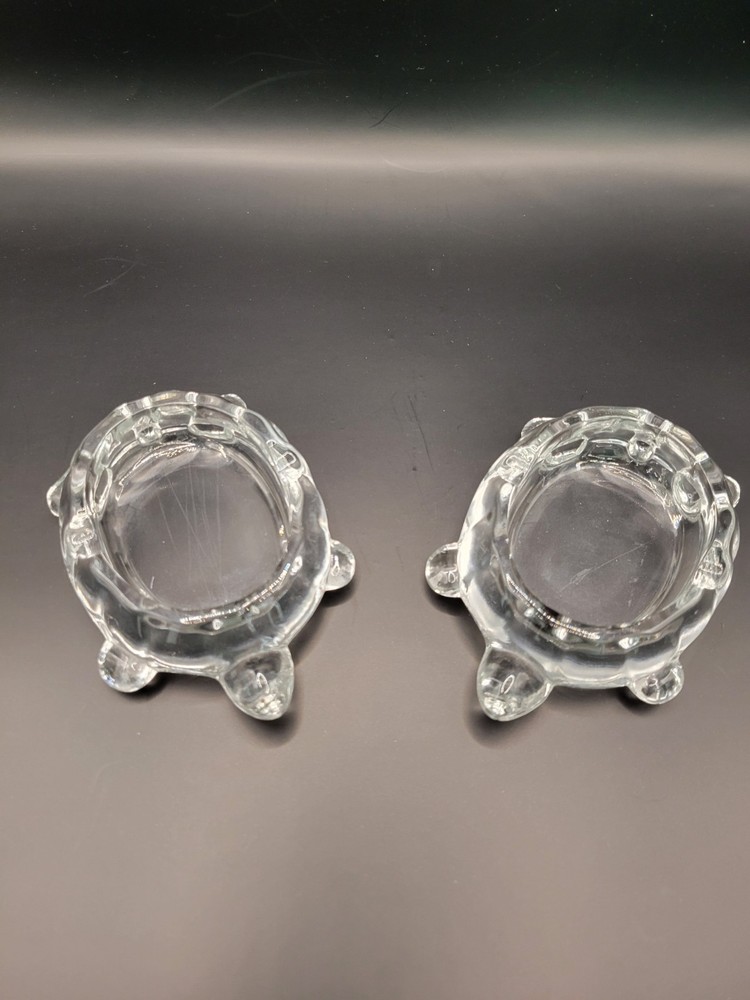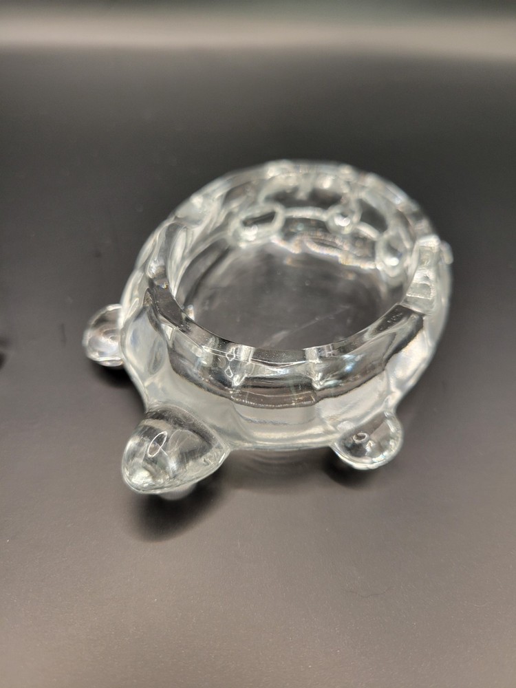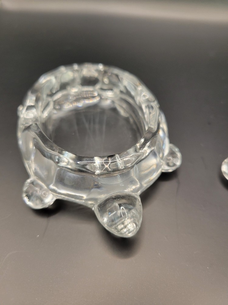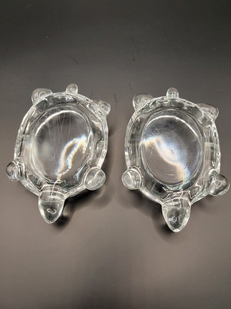 Add a touch of vintage charm to your decor with this pair of Westmoreland clear glass turtle ashtrays. Crafted in the United States, these 4" x 2 3/4" trinket dishes are perfect for storing your cigarettes or as a decorative piece. The turtle shape and animal theme make them an ideal addition to your living space. These original pieces are perfect for collectors and enthusiasts alike.