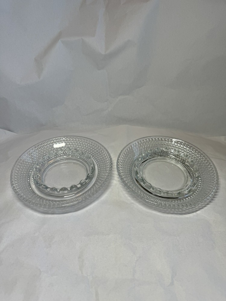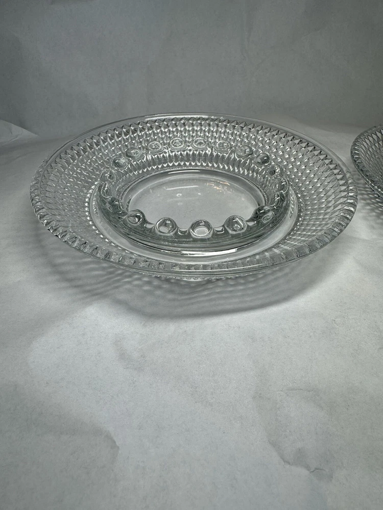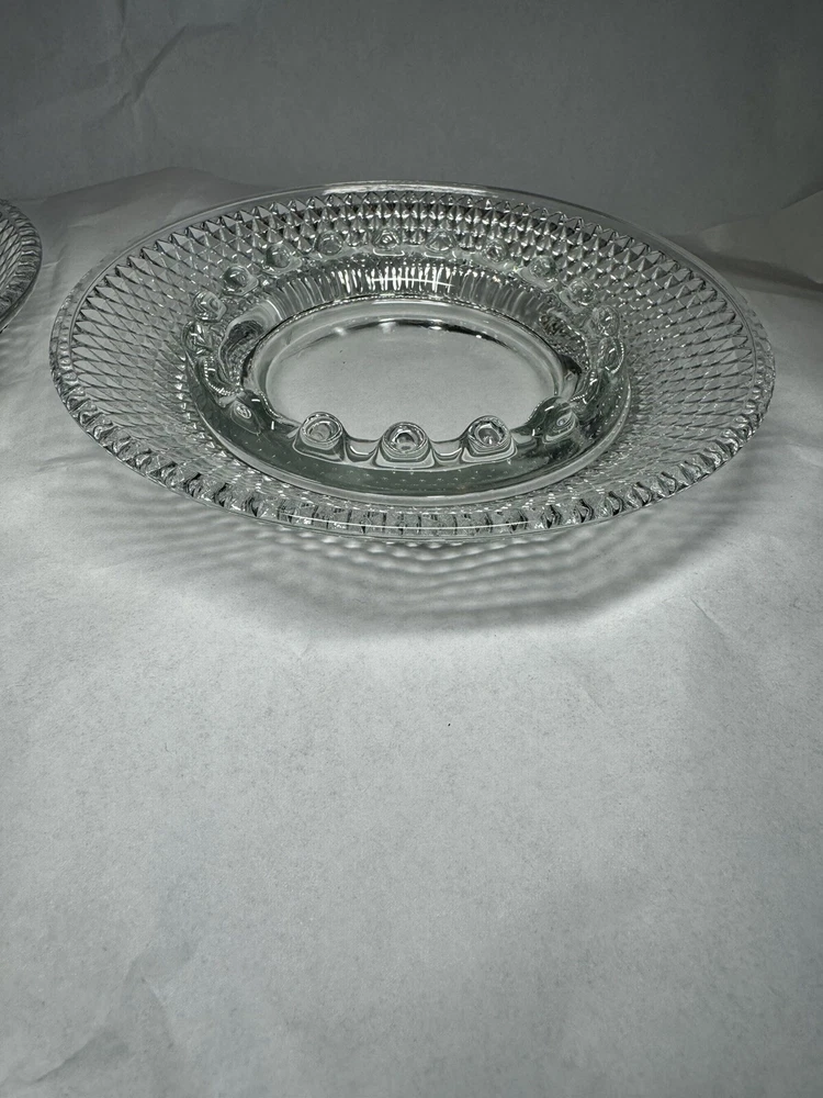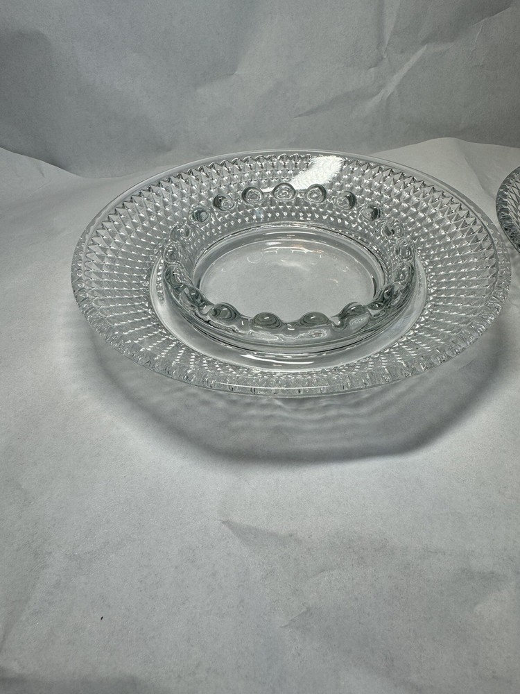 About 6 1/4" vintage English Hobnail glass ashtrays. I assume by Westmoreland Glass but I am not positive. Great shape, no damage to item that I noticed....