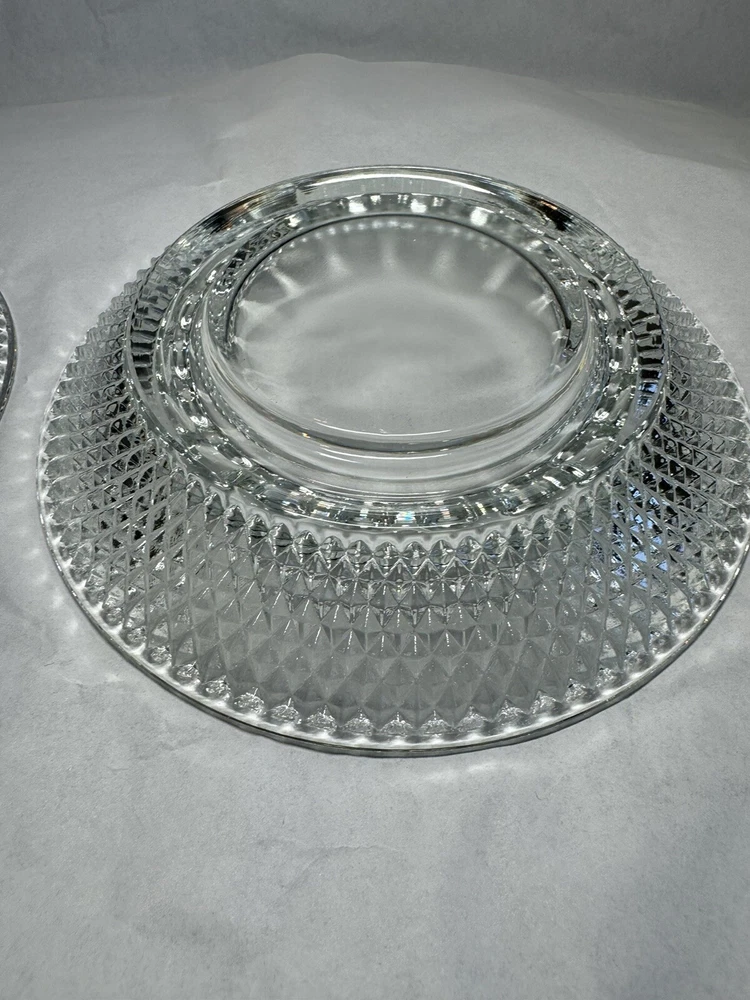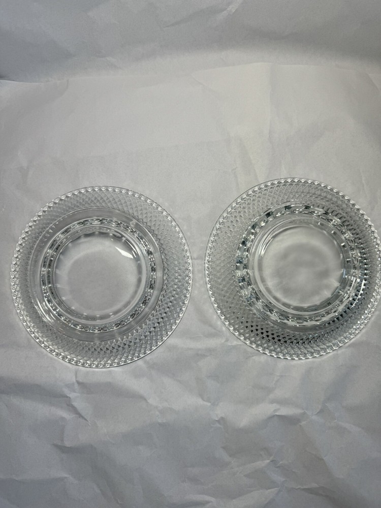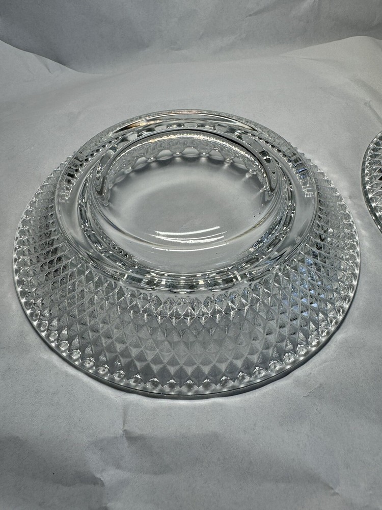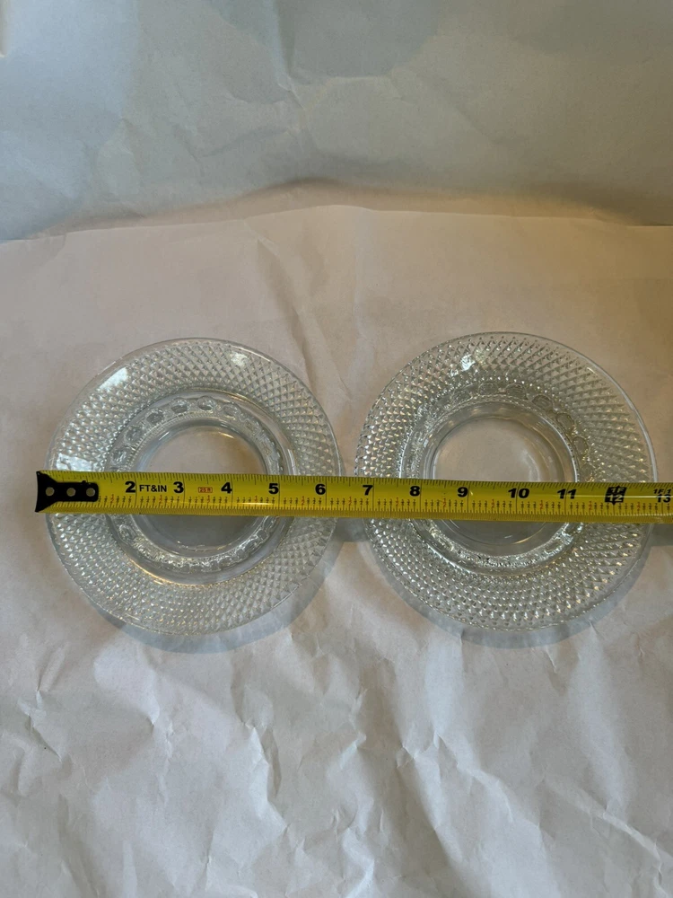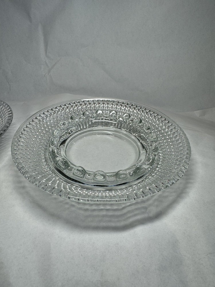 About 6 1/4" vintage English Hobnail glass ashtrays. I assume by Westmoreland Glass but I am not positive. Great shape, no damage to item that I noticed....