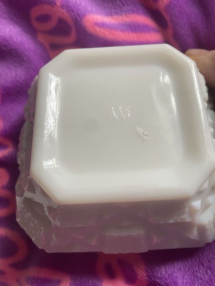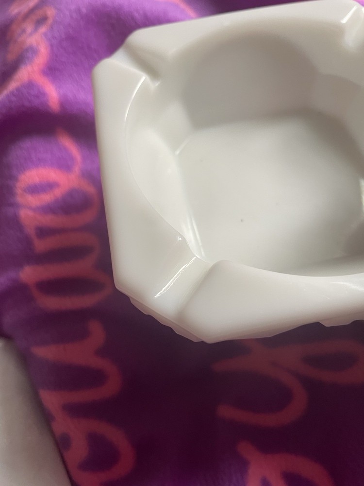 The product is a set of vintage Westloreland ashtrays done in this classic design. Made in North America in the 1950s, this limited edition set is a mid-century modern style with a glossy white finish. Measuring 4 inches in length and height, and 1.3 inches in depth, this ashtray is suitable for cigarettes and is an original production from the United States. The cut glass look adds to the charm and collectibility of this decorative pottery and glassware item.
