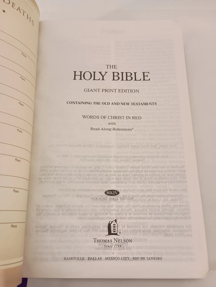 This 2006 edition of the Holy Bible, published by Thomas Nelson, features the Giant Print Version of the King James Version translation. The book is a paperback format, written in English and authored by King James Version, Nelson, and James Nelson. The Holy Bible is wrapped in a purple leather cover, making it a beautiful addition to any collection. Thank you for visiting my listing today and thank you for your interest in this item! My goal is to have a pleasant transaction resulting in a satisfied customer. I hope any transaction between us leaves you with a feeling of confidence knowing you can trust me and the items I offer here. *Most if not all my listings are set to accept offers. Feel free to send an offer and I will be happy to consider it!! *Please contact me with any questions or concerns and I will be happy to help. *Always examine the photos carefully, and if in doubt, email me with any questions you may have. *Please note that condition statements are offered as a guide only. They will always be somewhat subjective and reflect our opinion, which may not necessarily agree with someone else's opinion. PLEASE READ: I aim to please and I want my buyers to have a positive transaction with me. If you have questions, concerns, or special requests related to any of my items I hope you will contact me so we can work them out to your satisfaction. I sell my items to give you a great item at a decent price while making a little profit at the same time. If you feel the item you are interested in is too pricey do not hesitate to send me a fair offer and I will consider it. My goal is to satisfy your needs and mine so both parties can benefit. SHIPPING: If you prefer a different shipping method or company please contact me and I will do all I can to make that happen. If you have concerns or requests about the packaging of your item contact me and I will do all I can to accommodate them. Shipping costs are based on location in each state or country, the costs always differ. After I have received your payment I will ship your item out within 3 business days or less excluding weekends and holidays. BEFORE PURCHASING & BIDDING: **Please see all the pictures. I do not have great photography skills but I try to get the most accurate photos I can. If you are unsure about something you see in a photo contact me so I can do what I am able to answer your concern about the item. **I cannot stress enough that if you have any questions or concerns please contact me before purchasing and bidding. Communication can solve so much. **As a customer myself, I understand the meaning of customer satisfaction and my goal is to have nothing but satisfied customers. If you are not unsatisfied with your purchase I ask that you please contact me so I can take care of your issue. My goal is for you to be 100% satisfied. INTERNATIONAL BUYERS WELCOMED - PLEASE NOTE: I welcome International buyers! Please be aware that any custom/duties/taxes that the parcel might incur once it is out of the USA are the responsibility of the buyer. Please check with your country's customs office to determine what these additional costs will be prior to bidding or buying. Please refer to the eBay Site Map for more information if needed.
