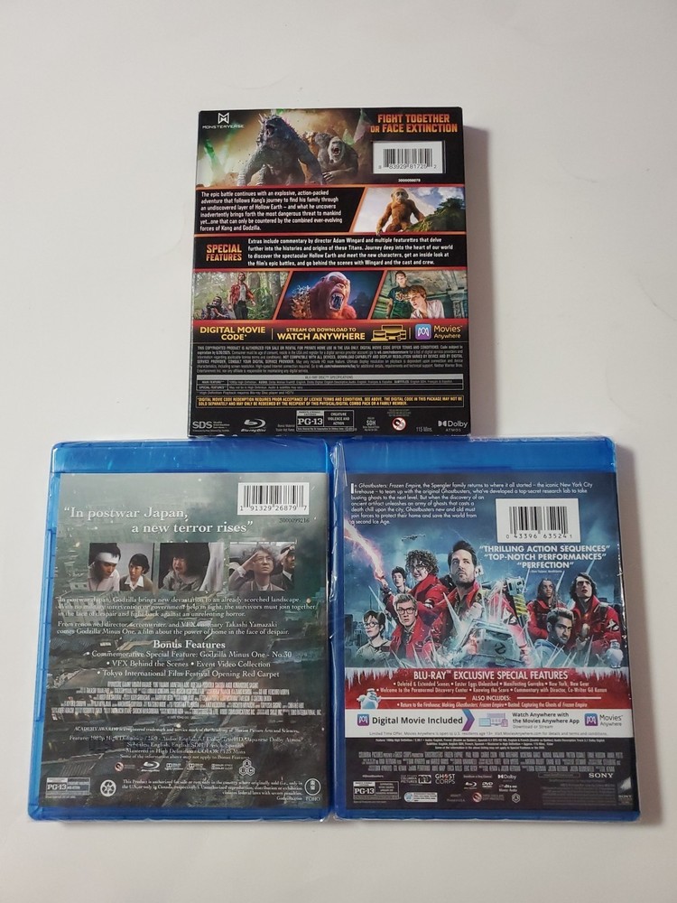 3 BLU-RAY MOVIE LOT, GODZILLA-KONG + GODZILLA MINUS ONE + GHOSTBUSTERS, FROZEN EMPIRE, GODZILLA MINUS ONE IS FACTORY SEALED, NO DIGITAL, OTHER TWO ARE OPENED TO REMOVE DIGITAL COPY, DVDS AND SLIPCOVERS ARE AS SHOWEN IN PICTURES, NO DIGITAL, LOT D4.