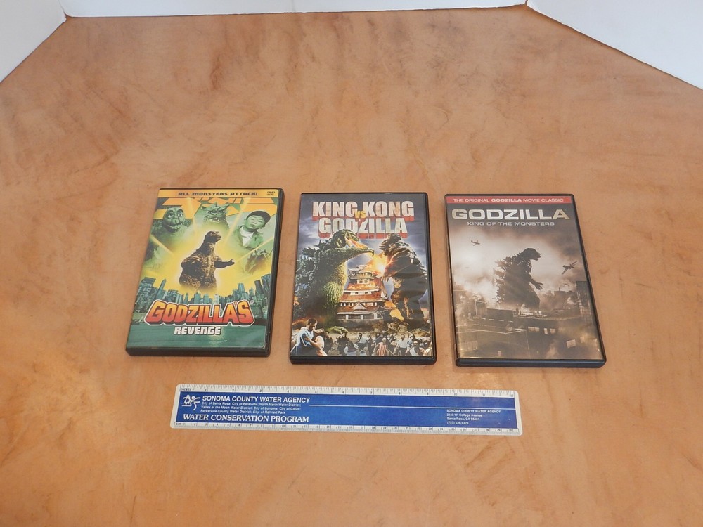 LOT OF 3 GODZILLA DVDs - KING KONG VS GODZILLA, GODZILLA'S REVENGE, AND GODZILLA KING OF THE MONSTERS. DVDs are all in very good condition, tested and work as designed. From a smoke free home, odor free. Please examine the photos and ask questions. Photos are part of the description. Be sure to check out our other listings for more surfing DVDs and other cool stuff. We are always happy to combine shipping to save you $$$$ All international orders will be shipped via eBay Global Shipping.
