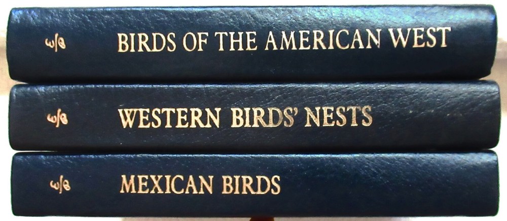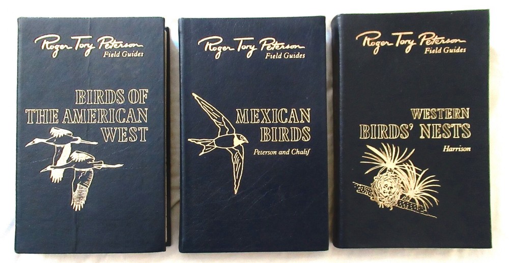 HERE ARE 3 EASTON PRESS EDITIONS OF THE ROGER TORY PETERSON FIELD GUIDES : #1 Roger Tory Peterson Field Guide BIRDS OF THE AMERICAN WEST Text and Illustrations by Roger Tory Peterson The Easton Press, Norwalk, CT, 1984, The Fiftieth Anniversary Edition Leather bound flex cover , very good condition Collector's Lifetime Edition, bound in handsome dark leather, with gilt titles and designs to front and spine, all page edges gilt, bound in satin ribbon bookmark Sponsored by the National Audubon Society and the National Wildlife Federation A Field Guide to Western Birds Illustrated with both color and black & white plates! #2 Roger Tory Peterson Field Guide WESTERN BIRDS' NESTS By Hal H. Harrison Map, endpapers, and logo by Mada Harrison The Easton Press, Norwalk, CT, 1996 Leather bound flex cover, very good condition, slight "curve" to front cover Collector's Lifetime Edition, bound in handsome dark leather, with gilt titles and designs to front and spine, all page edges gilt, bound in satin ribbon bookmark Sponsored by the National Audubon Society and the Roger Tory Peterson Institute Birds' Nest of 520 species found breeding in the United States West of the Mississippi River. Illustrated with both color and black & white plates! BONUS: Unused "snap'n peel" Roger Tory Peterson Field Guides book plate #3 Roger Tory Peterson Field Guide MEXICAN BIRDS By Roger Tory Peterson and Edward L. Chalif Leather bound flex cover, very good plus condition, nearly "as new" The Fiftieth Anniversary Collector's Lifetime Edition, bound in handsome dark leather, with gilt titles and designs to front and spine, all page edges gilt, bound in satin ribbon bookmark Sponsored by the National Audubon Society and the National Wildlife Federation Field marks of all species found in Mexico, Guatemala, Belize and El Salvador Illustrated with 48 color plates and black & white maps! ******************************** Please see our other listings of field guides and books on nature... we are happy to combine shipping fees! USPS Media Rate postage will be calculated @ 4 pounds weight GRADUATE OF BOOK SEMINARS INTERNATIONAL PROGRAM HOW IT WORKS WITH US: In other words; the fine print! For those buyers who reside outside the U.S., We are now enrolled in eBay's Global Shipping Program We like to have our auctions completed in a timely manner. If we have not HEARD FROM the high bidder by the FOURTH day after the close of the auction, we will file an UNPAID ITEM DISPUTE with Ebay. PLEASE : Bid Only If You Intend To Complete The Transaction. THANKS for your understanding in these matters. We are proud to let you know that we try to be ecologically responsible, nearly all of our packing materials are recycled or reused. THANKS FOR BIDDING WITH US!