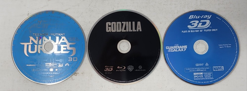 3 movies come in one TMNT case. Immerse yourself in a world of action-packed adventure with this lot of 3D Blu Ray movies. Included in the collection are the critically acclaimed superhero flick, Guardians of the Galaxy, the epic monster movie, Godzilla, and the fan-favorite Teenage Mutant Ninja Turtles. Whether you're a long-time fan or a newcomer to these franchises, these Blu Ray discs are sure to provide hours of thrilling entertainment. So sit back, relax, and get ready to be transported to another world!