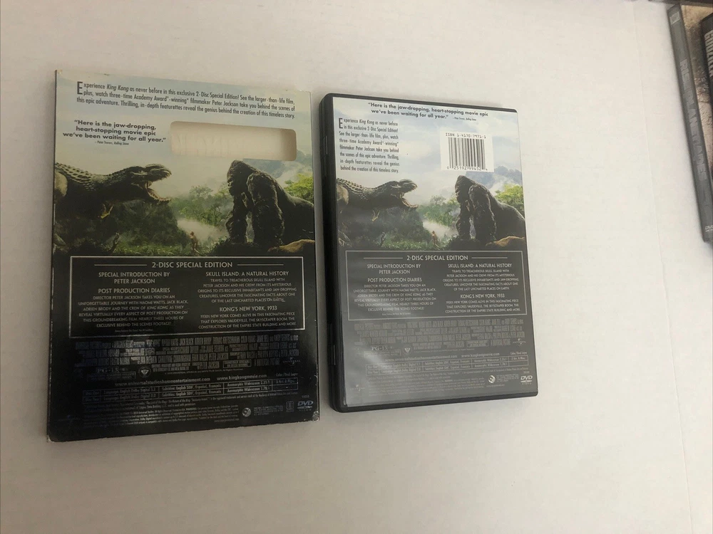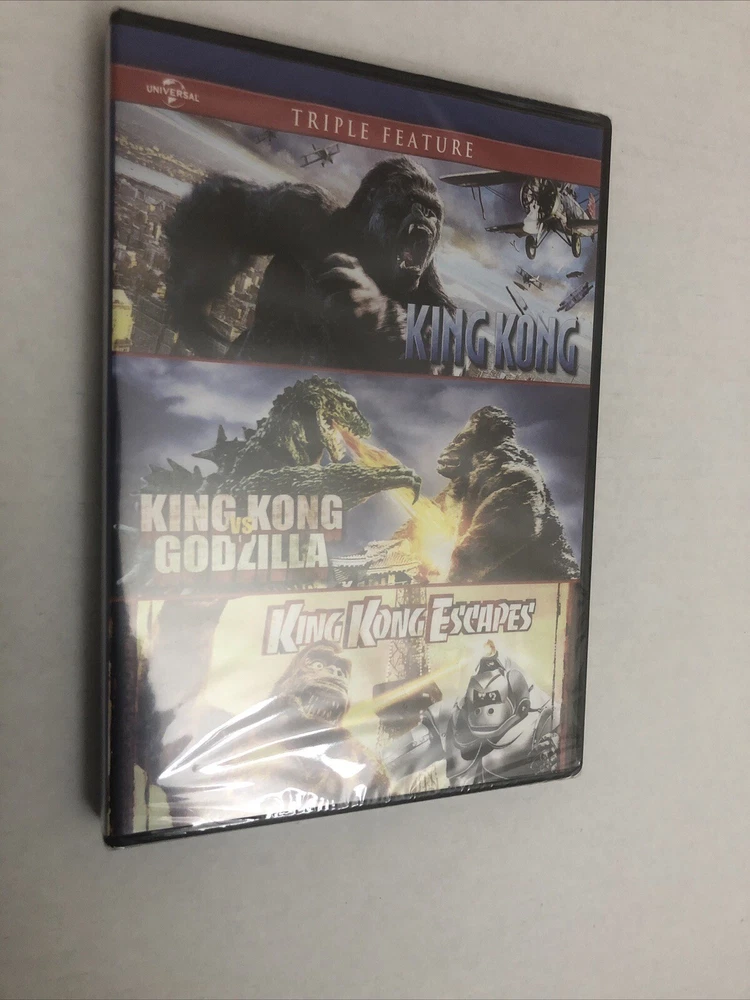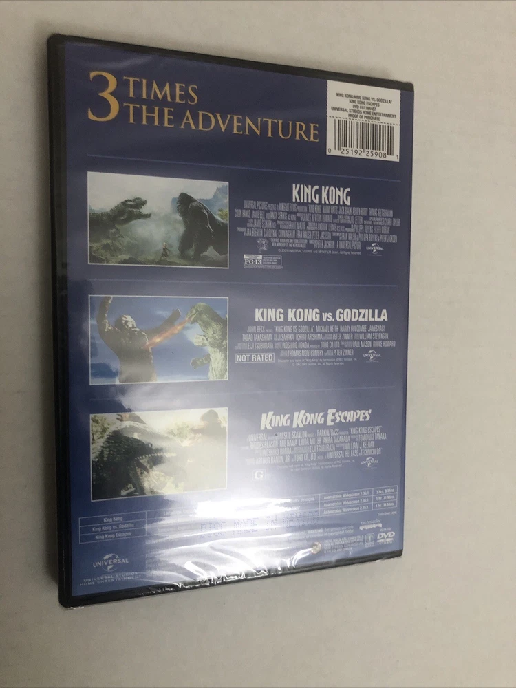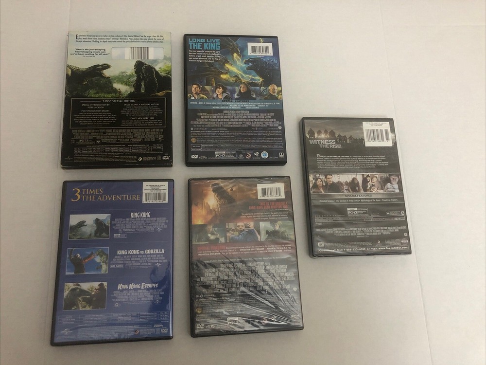 5 Action & Adventure DVDs Godzilla(2014) is new and shrink wrap has marks/tears in it(see picture). Godzilla:King Of The Monsters(2019) is pre-owned/good condition. DVD case has marks on it(see picture). Rise Of The Planet Of The Apes(2011) is new and shrink wrap has tears/marks in shrink wrap(see picture). King Kong(2-Disc, 2006) is pre-owned/good condition. DVD case/sleeve has marks on it(see picture). DVD case has tear in front of it(see picture). King Kong Escapes/King Kong Vs. Godzilla/King Kong(2014, Triple Feature) is new and has light marks on shrink wrap(see picture). Color may vary due to lighting. All sales final.
