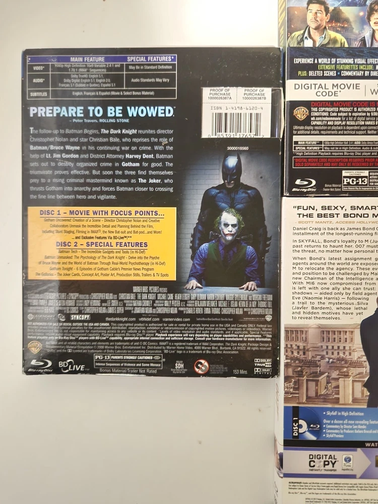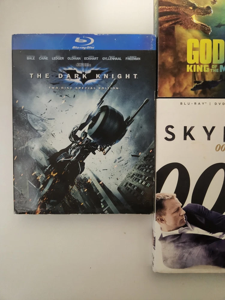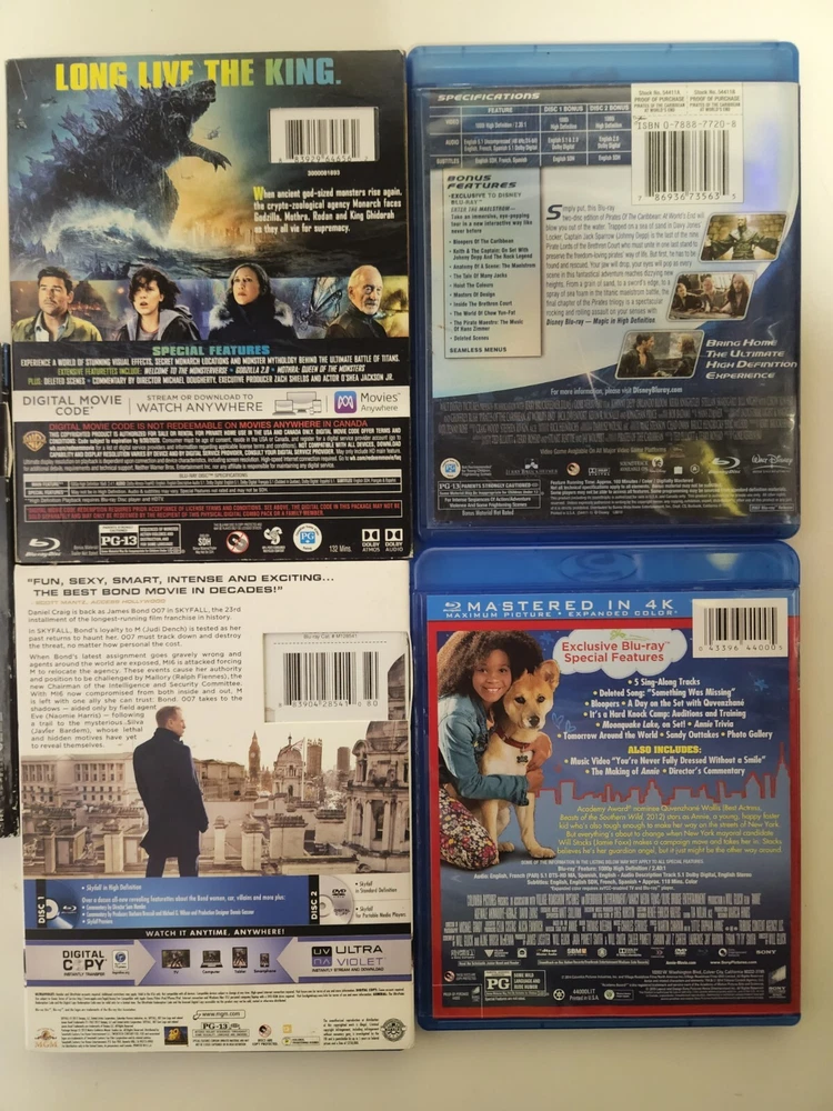 5 Blu-ray Lot. Dark Knight, Annie and Pirates of the Caribbean are complete. Skyfall is only the Blu Ray copy, Godzilla is dvd and digital code only