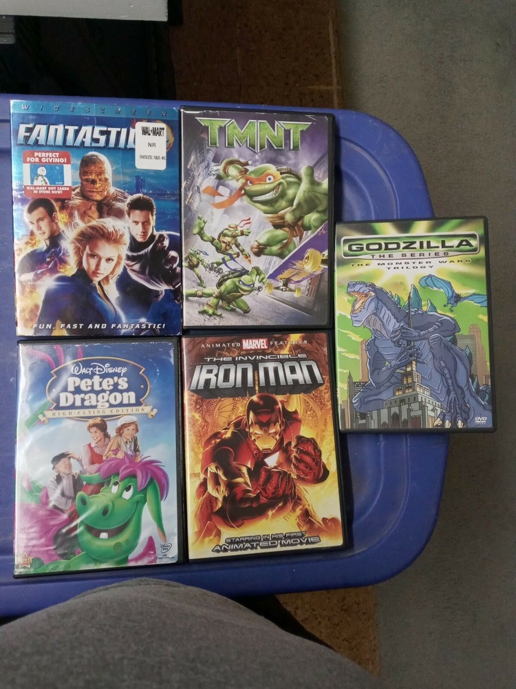 5 Kids Dvd Movie Bundle ( Godzilla Trilogy, Fantastic 4, TMNT, Pete's Dragon, Iron Man Animated ) Pre - Owned.