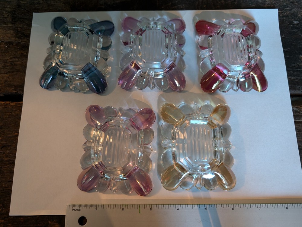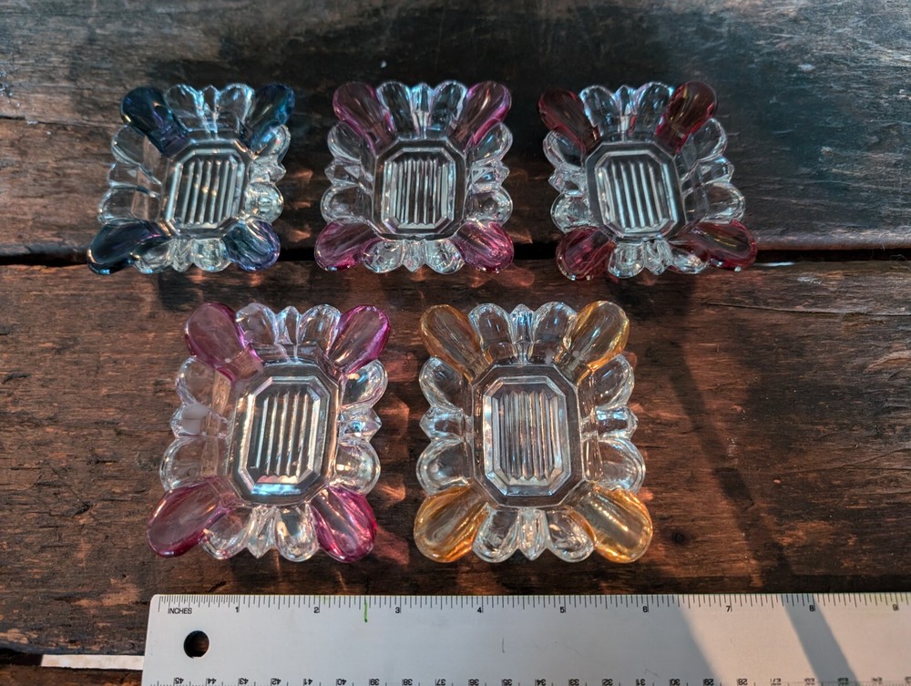 5 pcs of 1960s Westmoreland cut-glass ashtray/trinket dishes in the colors of red, blue, purple, pink and yellow. They are approximately 1/2" tall, 3 1/4" long and 2 1/2" wide. Great for jewelry, space change and keeping track of small items.