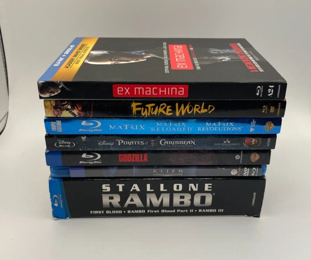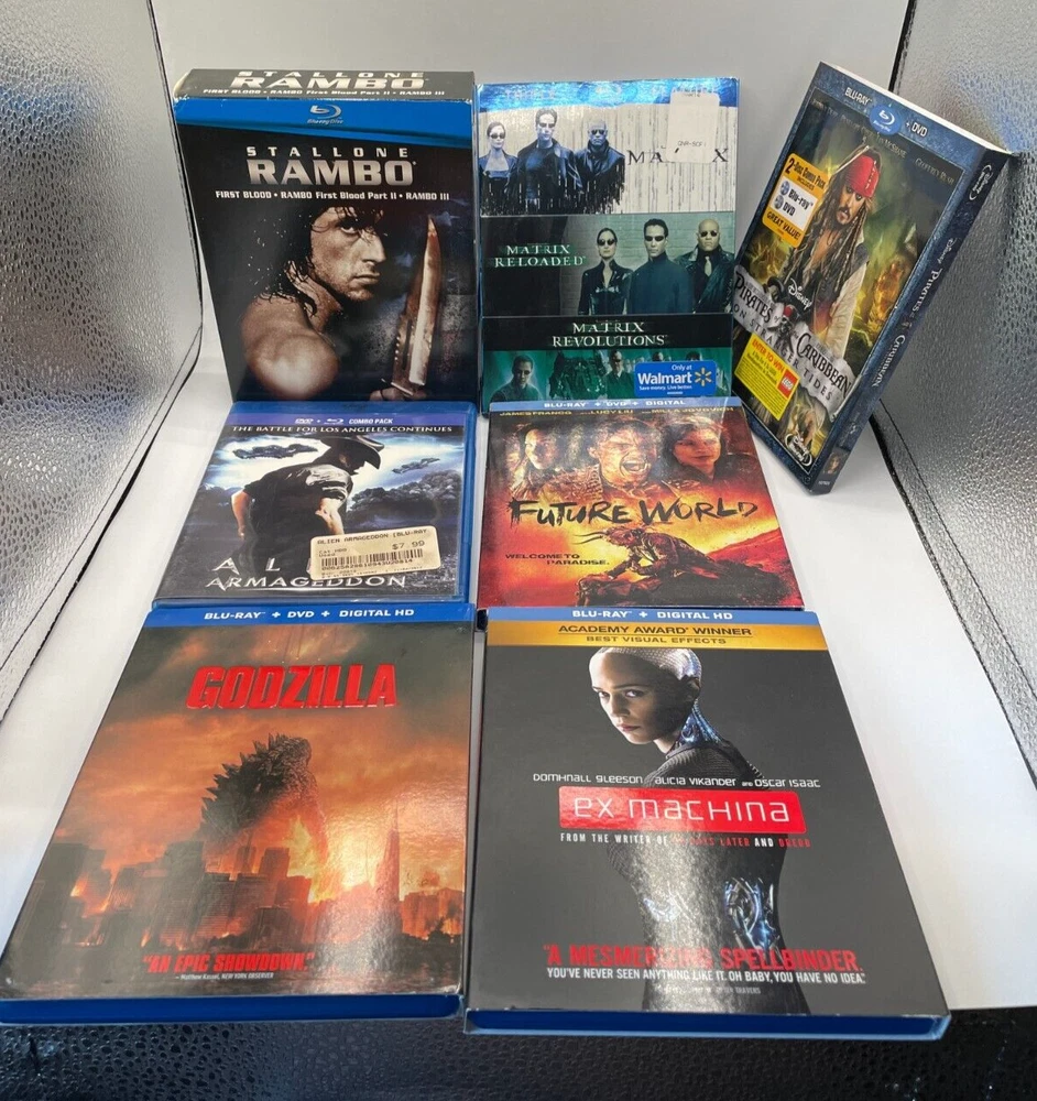 7 Blu Ray Lot Rambo Trilogy Matrix Trilogy Godzilla Ex-Machina Pirates of Caribb...