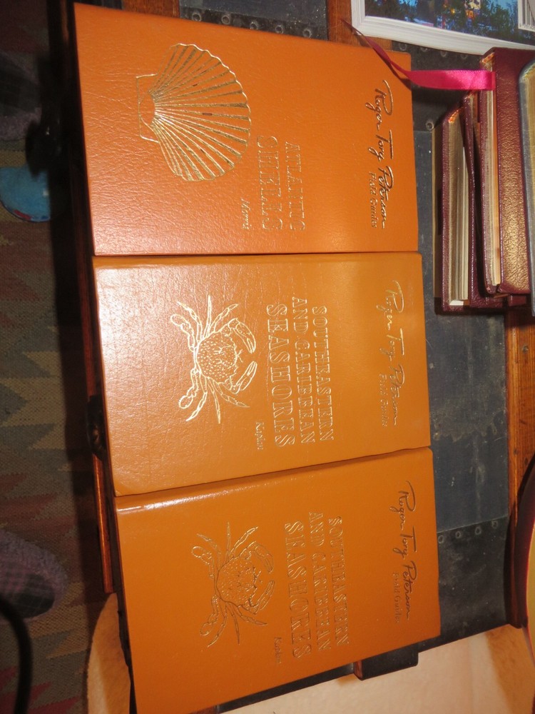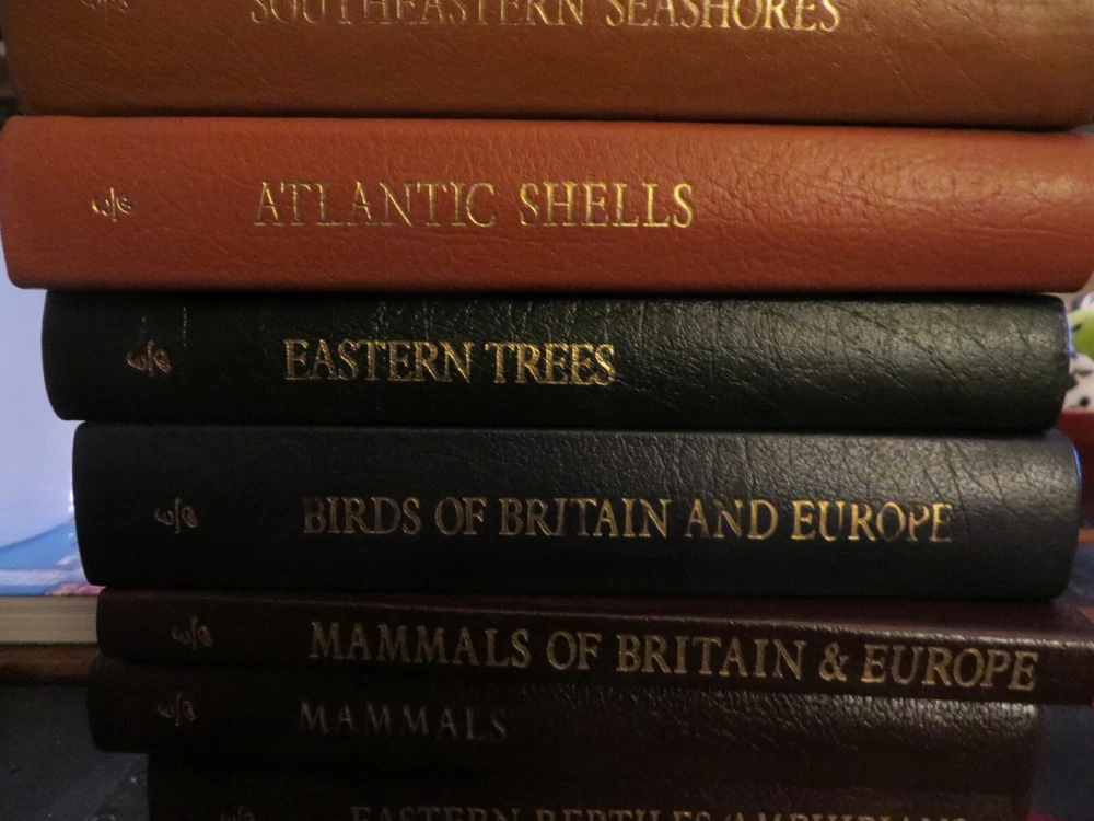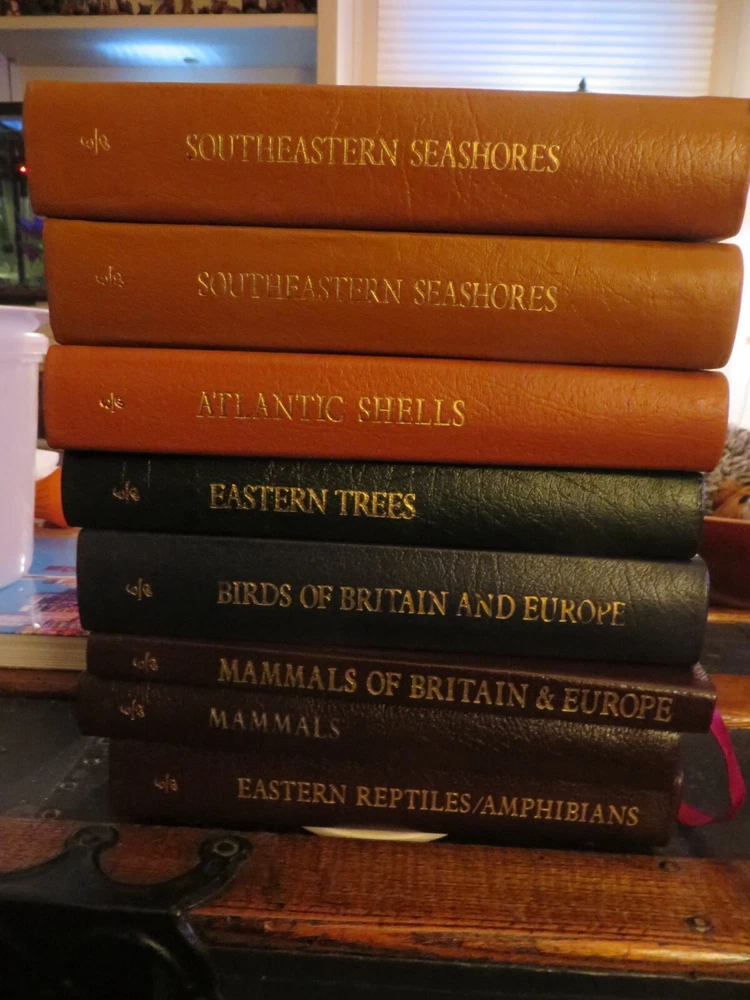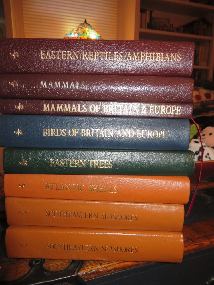 8 books - 7 different titles. 2 copies of Southeastern Seashores. They are as follows: Mammals Mammals of Britain & Europe Eastern Reptiles/Amphibians Birds of Britian and Europe Eastern trees Atlantic Shells Southeastern Seashores, 2 of these leather covers, gilded pages. the books have been read, some more than the others. No tears or rips. Some of the gilded lettering has wear. some of the corners have some slight dents, some pages may be creased. Still in nice shape and great field guides