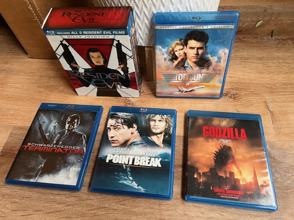 9 blu-ray movies pictured, all excellent condition with mint discs 5 Resident Evil Movies Collection Point Break Terminator Top Gun Godzilla (2014) Next business day shipping...