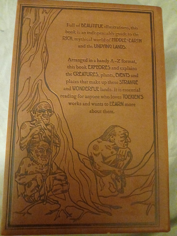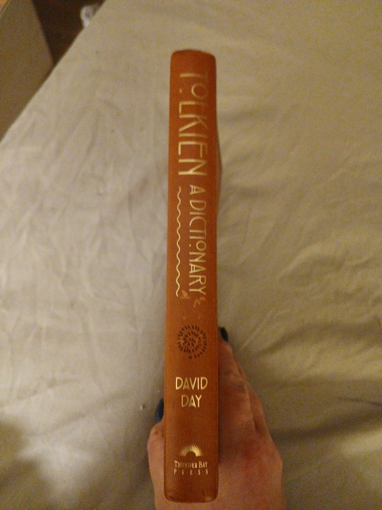 The product is "A Dictionary of Tolkien" by David Day, published in 2013 by Printers Row Publishing Group. This illustrated trade paperback is a literary criticism and reference book on the works of J.R.R. Tolkien, with a focus on fantasy and science fiction themes. It has an embossed faux leather cover, measures 7.7 inches in length, 0.8 inches in height, and 5.2 inches in width, weighing 13.4 ounces, and contains 288 pages of information and illustrations.