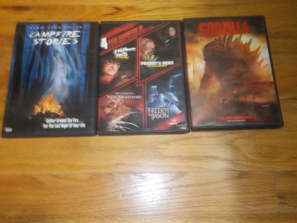 3 DVDS, 6 MOVIES 1. A NIGHTMARE ON ELM STREET PART 5-8, 2-DISC SET - 1 DISC HAS NO SCRATCHES. 1 DISC HAS A FEW ,LIGHT SCRATCHES 2. CAMPFIRE STORIES - LIKE NEW 3. GODZILLA (REMAKE) - LIKE NEW