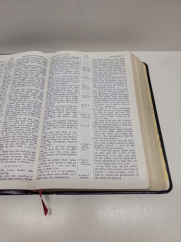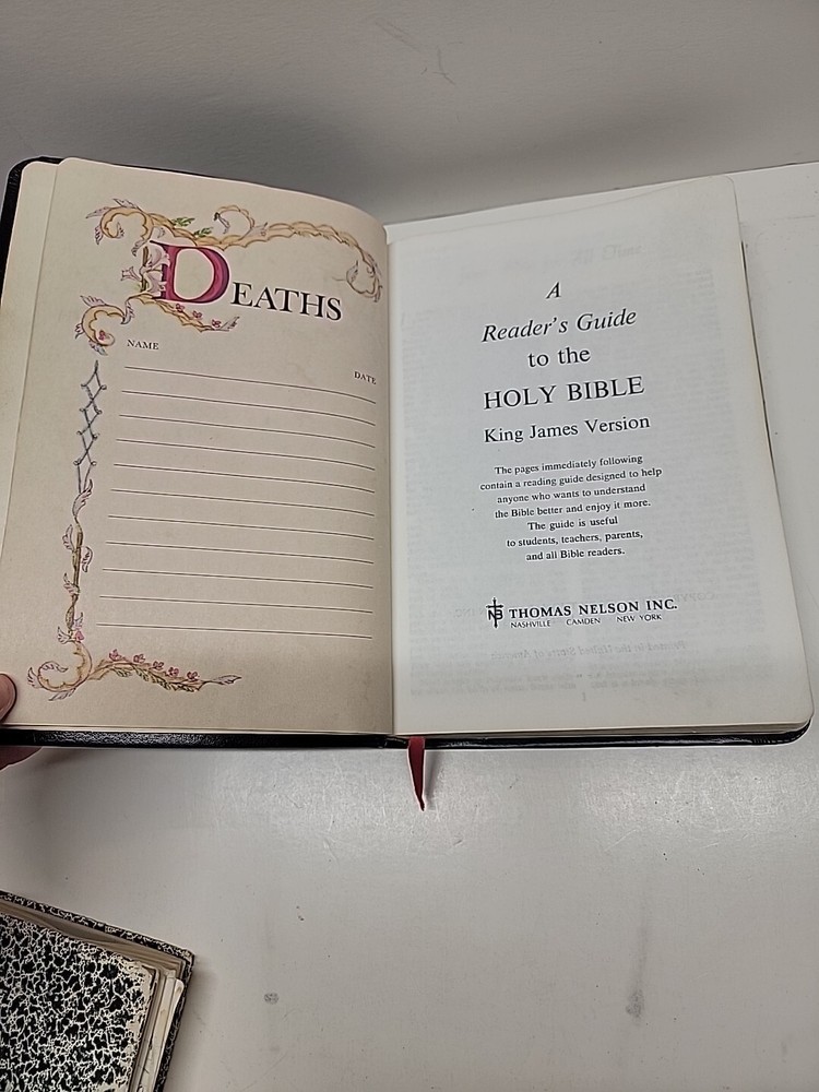 This is a valuable guide for readers of the King James Version of the Holy Bible. The book was published by Thomas Nelson, Inc. in 1972 and is an original print. It contains information about the binding, which is made of Genuine Bonded leather, printed in back. Has special attributes such as large print, larger print than most bubbles. The book discusses the topic of Christianity and Bibles, with a focus on the subject of the Bible itself. The language of the book is in English and it is an antiquarian and collectible item. No writings in the book, all pages intack, one page in the index has been trapped, see pictures. The pages immediately following containing reading guide. Designed to help anyone who wants to understand the Bible better and enjoy it more. The guide is useful to students, teachers, parents and all bible readers.