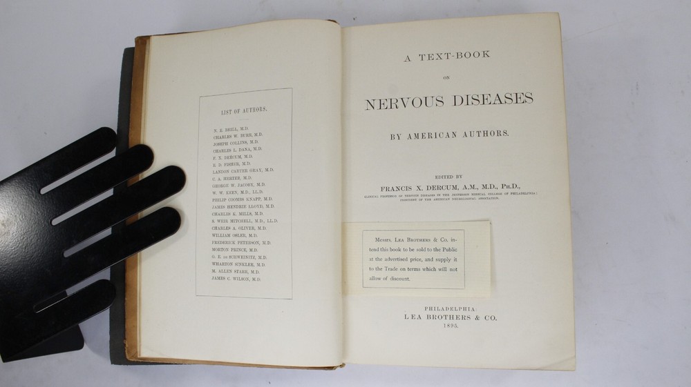 A Text-Book on Nervous Diseases by American Authors; Editied by Francis X. Dercum Description 1895, Philadelphia: Lea Brothers & Co., Ex-Library, Leather, First Edition, 1056 pp plus 16 pp of publisher ads, Illustrated, Text in English. Both hinges splitting, Various page edges are chipped, Exposed stitching through text. Offered by the Antiquarian, Rare, and Collectible department of Better World Books. Your purchase benefits global literacy programs. 100% satisfaction guaranteed. Payment Payment is accepted via PayPal, Google Pay, and Credit Card ( Mastercard, Visa, Discover, and American Express ). Payment is expected to be completed within four (4) business day (Mon-Fri). Items not paid for within four (4) business days will result in order cancellation and product being relisted at original listing price. Shipping Domestic Shipping: Standard Shipping has a 1-2 business day handling time. Once orders are shipped they will arrive in 2-8 business days with tracking included. International Shipping: International Shipping has a 1-2 business day handling time. Once orders are shipped they will arrive in 10-21 business days. Terms of Sale We offer a 100% satisfaction guarantee on all products. Should you be unhappy with your order, or would like to arrange a return, please contact us within 30 calendar days of receipt. About Us Better World Books is a for-profit, socially conscious business and a global online bookseller that collects and sells new and used books online, matching each purchase with a book donation. Each sale generates funds for literacy and education initiatives in the U.S., the UK, and around the world. Since its launch in 2003, Better World Books has raised $35 million for libraries and literacy, donated over 38 million books, and reused or recycled more than 475 million books. Contact Us Our team is always happy to help and is available Monday through Friday (7:00 AM - 2:30 PM ET). Send us a message through eBay should you have any questions about listings, orders, or offers.
