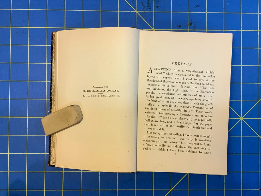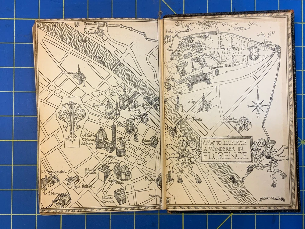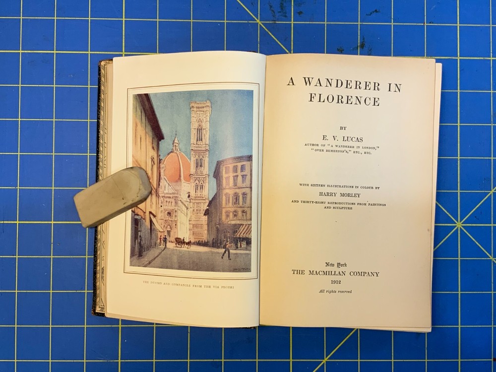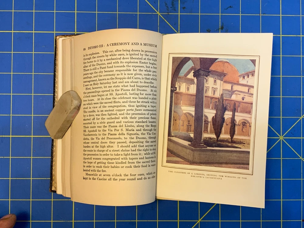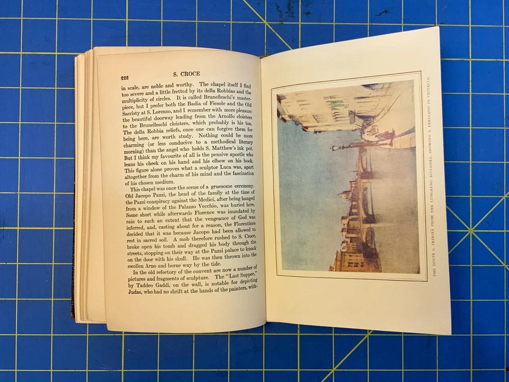 This edition is a wonderful travel guide for the entire Florentine environment. Filled with rare colorized images as well as black and white. It would provide a perfect companion for visits to museums, churches and architectural sites. A curiosity I noted while photographing it for this listing, is that when I moved the ribbon page marker, it had been in the same untouched location for so long, it had left a fingerprint on the paper. A true untouched gem. This book and other travel documents were obtained and collected by my Great Grandparents CW Seamans & IG Seamans and grandparents EA Self and DS Self during the ubiqitous european trips of the late 1890s thru the late 1930's. Travel was by transatlantic liner, postcards were purchased as books to send correspondence home and photographs were developed before returning home by professional photographers. Taken in total, the novels, guidebooks, art books, postcards and travel ephemera provide a unique and comprehensive view of 2 generations of one families travels over a 40 year period - all before WWII. These pieces have been sitting untouched and unappreciated for 3 generations and I would like to share these unique snapshots in time with other people. Please feel free to contact me if you want additional information about the provenance and the other objects and items I have from these couples and this period of history