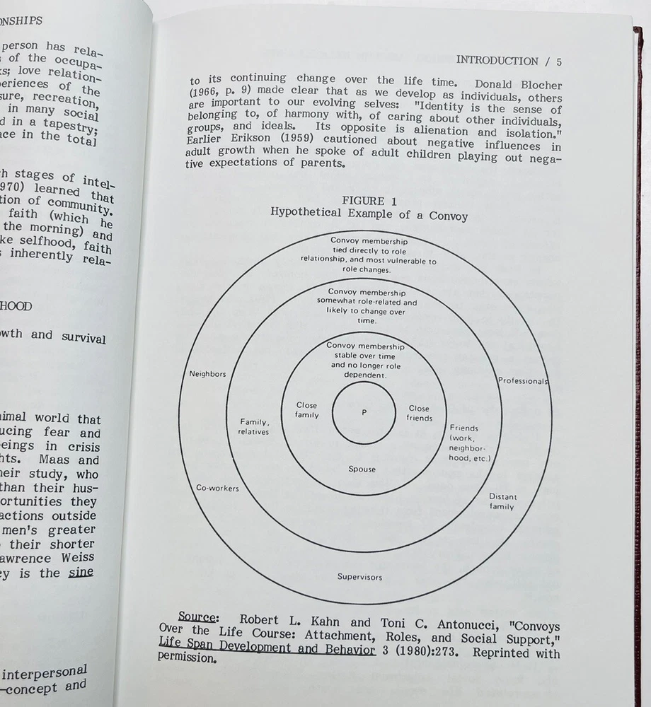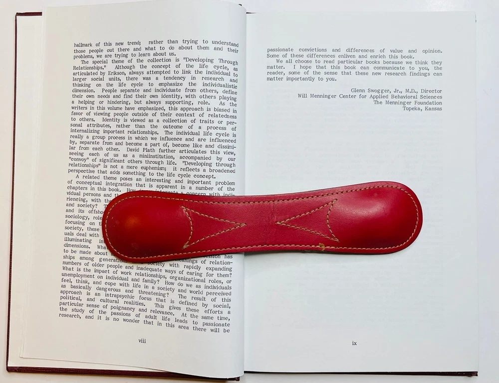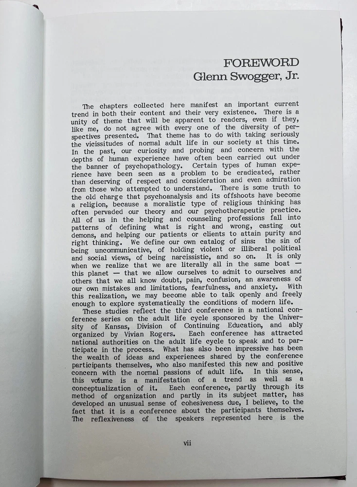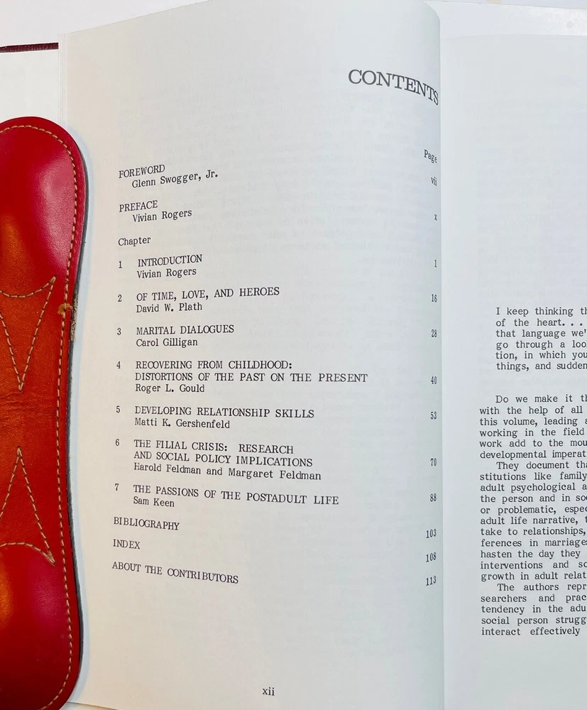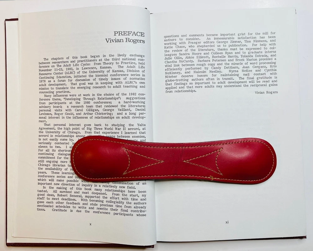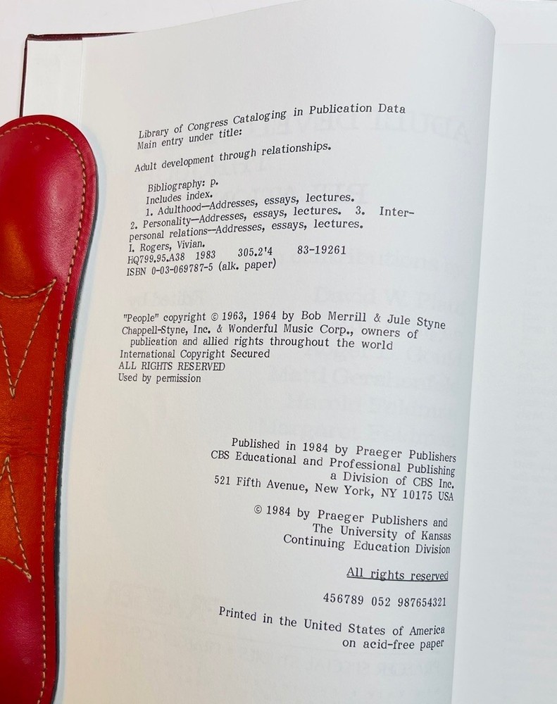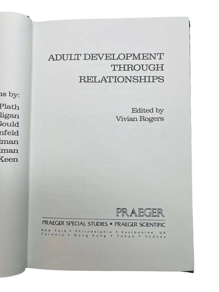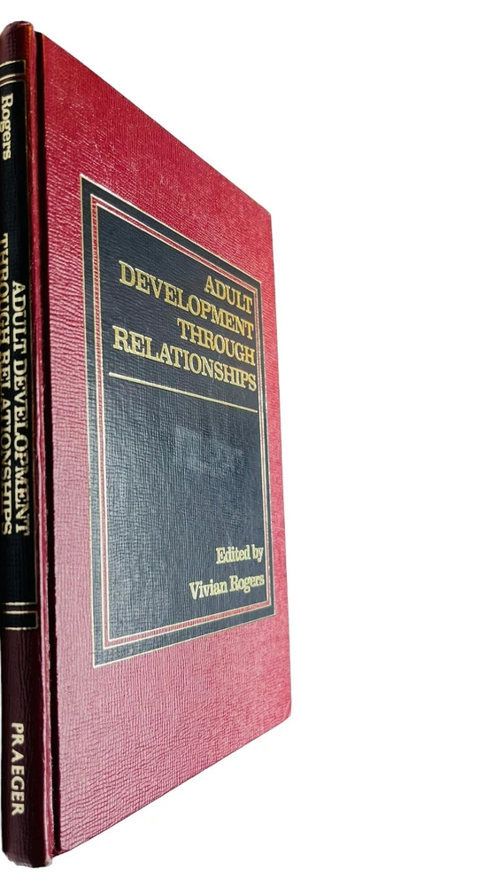 ADULT DEVELOPMENT THROUGH RELATIONSHIPS, edited by Dr. VIVIAN ROGERS, 1984 1st edition, SIGNED to Dr. Glenn Rogers, Jr., who wrote the book’s FOREWORD. Both worked at the MENNINGER FOUNDATION when it was located in Topeka, Kansas. Corner bumps on front bottom and rear top covers. A small strip of former adhesive on front cover shows from side view. All in all, a terrific copy of an EXTREMELY RARE scholarly work. I think the book is bound in leather. If not, it’s done impeccably in faux leather. See photos. Shipped via USPS Media Mail Item location: Books 3rd floor