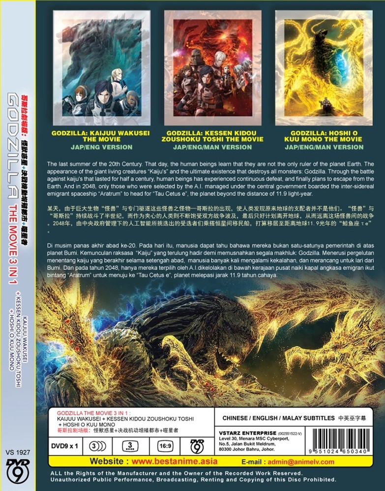 TITLE : GODZILLA THE MOVIE 3 IN 1 * ENGLISH DUBBED * Number Of Disc : 1 Number Of Episode : 3 In 1 Movie Language : Japanese / English Subtitle : English / Chinese Disc Format : NTSC Region Code : All Region / Region Free "0" Condition : NEW, Original & Licensed Item Payment We Accept PAYPAL Payment is required within 7 days of purchase. if for any reason you are unable to pay within 7 days, please contact us prior to bidding/buying. We are flexible with our payment terms for people who contact us first. Delivery Free Register Track Your Shipment 10 ~ 21 Days Without Sat - Sun Working Days. Item will be shipped ONLY after clearing of payment. All order will process 2 ~ 3 working days ( NOT INCLUDED WEEKED OR PUBLIC HOLIDAY ) after received the payment. We only ship to confirm address on " EBAY INVOICE ORDER DETAIL " All DVDs will be bubble wrapped for better protection. Return Buyer Pay The Return Postage. 30 Days Returnable. Items must be returned in perfect original condition, buyer responsible for returns shipping cost. Refunds will be arranged thru PAYPAL . Feedback Should Any Problem Arise, Please E-Mail Let US Know & We Will Do Our To Correct Any Problem