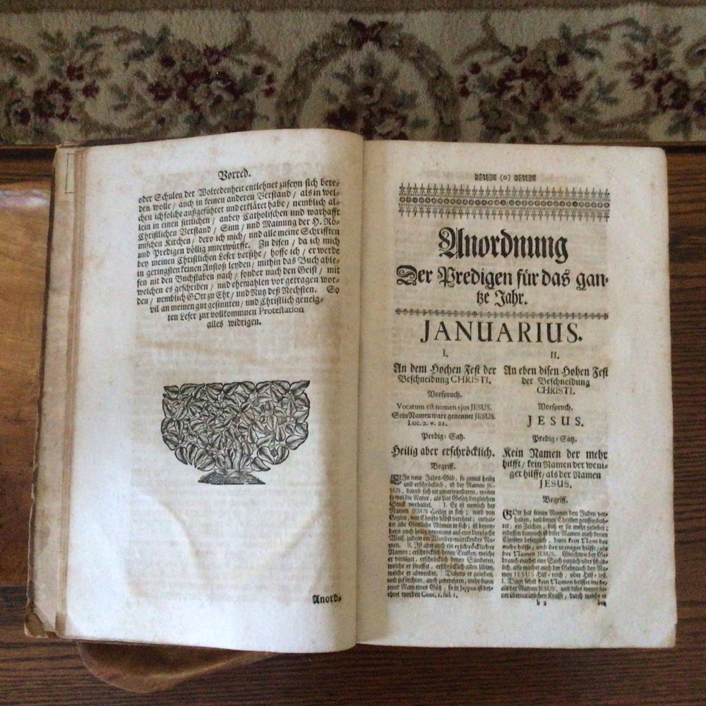 This is a limited edition, numbered ,528+ pages, illustrated, original Bavarian,German language, book titled, 'The Opened Sanctuary' by P. F. Hoger, S.J., J. A. de La Haye, printer. It is a religious text by P. Francisco Hoger S.J. , authorized by both the religious and secular authorities , published in 1725 in Ingolstadt, Bavaria, Germany by Johann Andreas De La Haye. The book is in leather binding , vellum pages, and is a first edition. The text is about the sanctification of Christians and explanations of the wonder of God in his saints. It includes sermons for church festivals and other celebrations, presented for the benefit of the people. The book was published with the permission of both the religious authorities ( Superior of Jesuit Order) and the secular authority ( The Holy Roman Emperor). Von P Francisco Hoger, S.J., (1664-1727) was the author and preacher in the Baroque style. This style of oratory was characterized by abundance rather than concise values. This text reflects the author’s beliefs as expressed in a separate writing in 1720. He then advised the listeners of Catholic preachings to pay attention to three points: 1) listeners should possess a great desire for the word of God. 2) he should have a holy intention with reference to the sermon. 3) he should attempt to unite himself with God in prayer to the Holy Spirit. In the words of the preacher : “ the characteristics of a Christian listener, which he must bring with him to church and which must proceed the sermon; desire good intentions and prayer. The sermon has not yet com to an end with the ‘Amen’. If the believer attended the service with devotion and attention, than he has done his part, but if he merely listened to the sermon, then his duty is not yet at an end; he must also put into practice what he heard and learned in the sermon..” Johann Andreas de La Haye was both a publisher and bookseller between 1735-1746. This book used a Gutenberg type level press; that was known as xylography. Binding is referred to as somber binding, used between 1670-1725 to cover bibles and devotional books. Usually comprised of fine goatskin featuring tooling in blind. Vellum: high quality parchment, traditionally made from calfskin. Three distinct stamps: RED: VERKALETE DOUBLETTEN D : AARG SOLD, DUPLICATE, AARGAU, SWITZERLAND. AARGAU is the Swiss canton closest to Bavaria. Approximately 265 miles from Ingelstadt, Bavaria. BLUE : BIBLIOTHECA DOMAS ( library house) CONGRA. ( congregation abbreviation) then smear. TOP LEFT CORNER OF INSIDE FRONT BINDING: BIBL.C.SS.R AD S.JACOBUM,BALTIMORI NUM.,316 Lit.D Means: Bibliotheca Congragationis Sanctissimi Redemptoris ( library of the Redemptorist religious order) ( located at) AD S. JACOBUM, BALTIMORE - former St. James the Less Parish, House Library - home of retired Redemptorist missionaries between 1833-1986. To be insured for full purchase amount. Additional photo’s available upon request.
