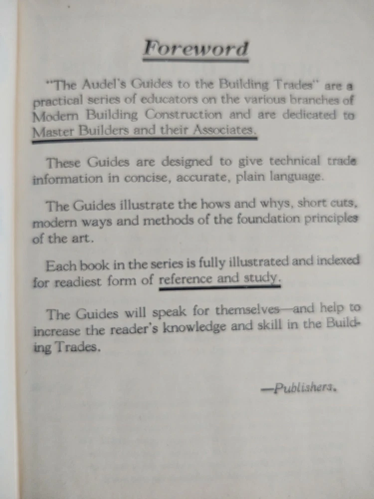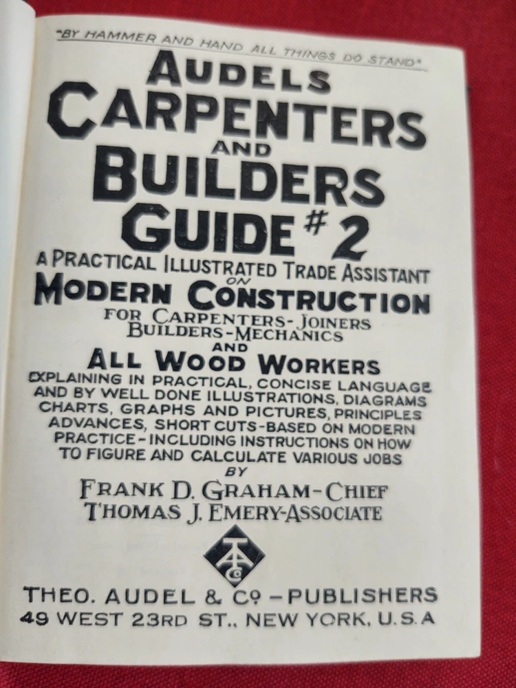 AUDELS CARPENTER AND BUILDERS GUIDE 1949 by Frank D. Graham & Thomas J .Emery. Published by Theo. Audel & Co. This informative 848 page book has many illustrations as well. It measures 5" by 6 3/4" and is in good condition I ship via USPS and only within the USA. Thank You..
