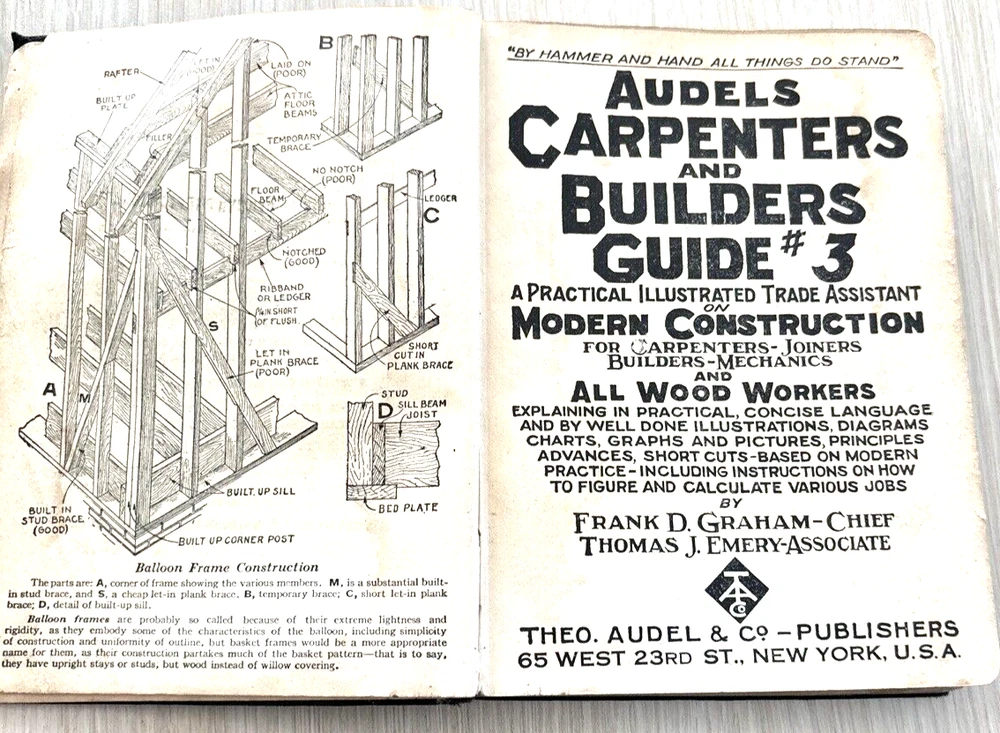 AUDELS CARPENTERS & BUILDING GUIDE # 3 BY FRANK GRAHAM & THOMAS EMERY ILLUSTRATED SOFT LEATHER COVER GOLD EDGED PAGES TAPED WATER MARKS