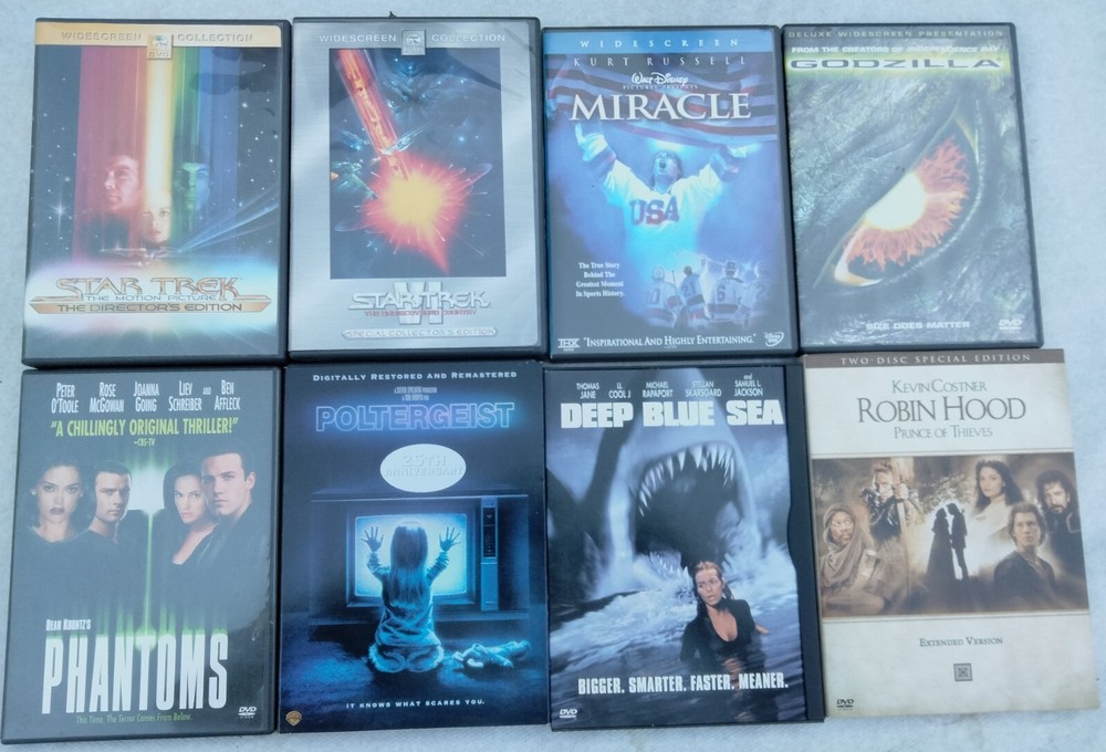 Set includes: Star Trek: The Motion Picture Director's Edition (2 disc set) Star Trek VI: The Undiscovered Country (2 disc set) Miracle 2004 (2 disc set) Godzilla 1998 Phantoms Poltergeist (w/ Slipcover) Deep Blue Sea 1999 Robin Hood: Price of Thieves (2 disc set) Feel free to ask any questions before bidding. Good luck.