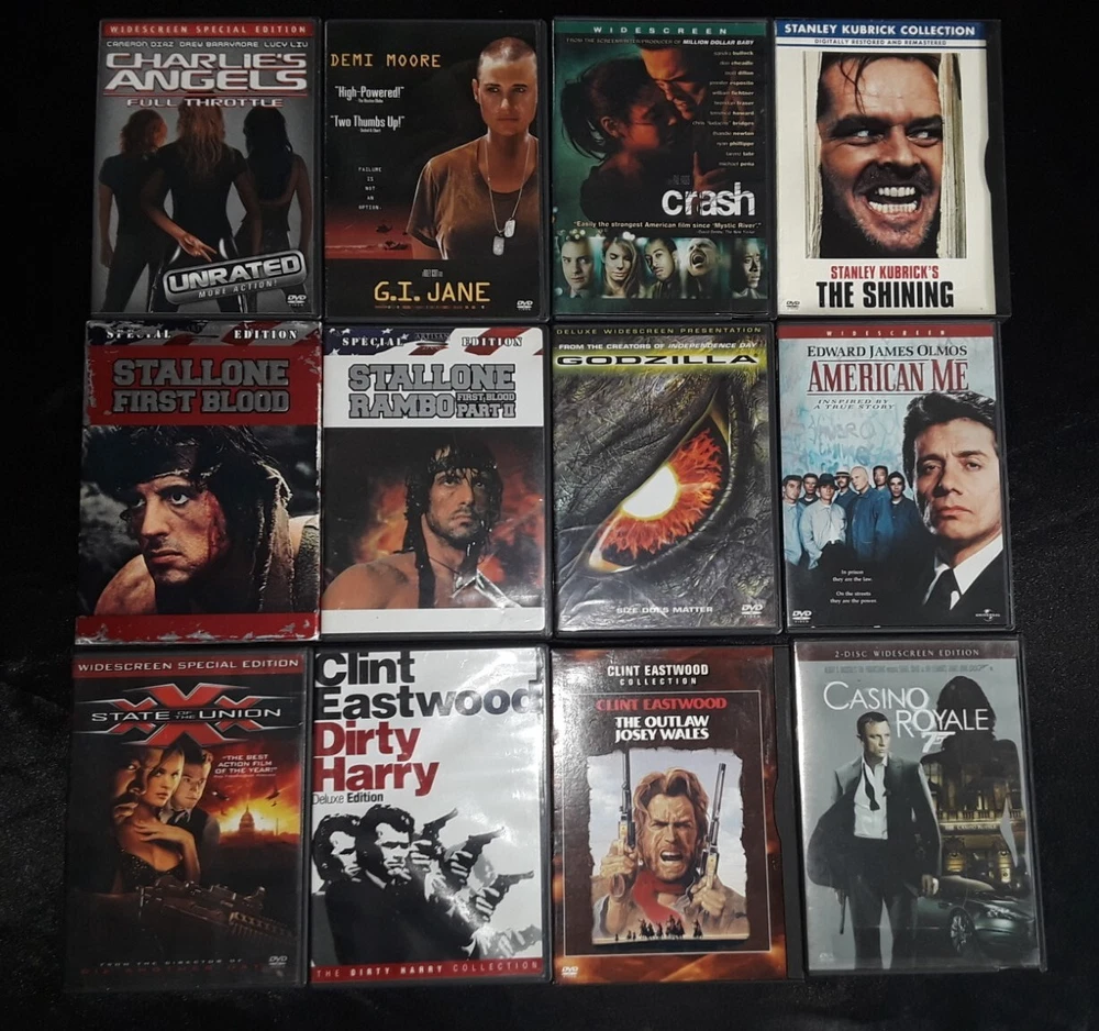 12 DVD lot... XXX state of the Union, Dirty Harry, The Outlaw Josie Wells, Casino Royal 007, Charlie's Angels (Unrated), G.I. Jane, The Shining. Crash, American Me, Godzilla, Rambo First Blood, Rambo ...