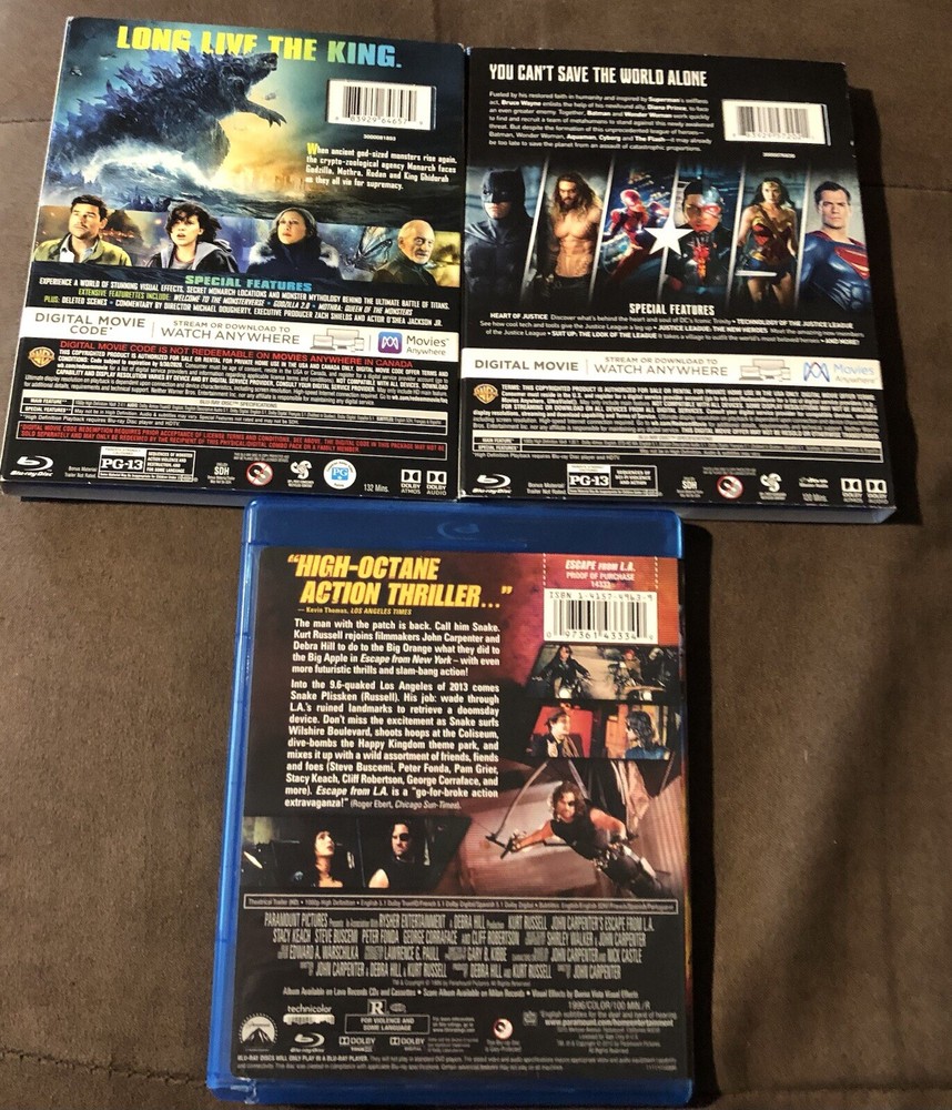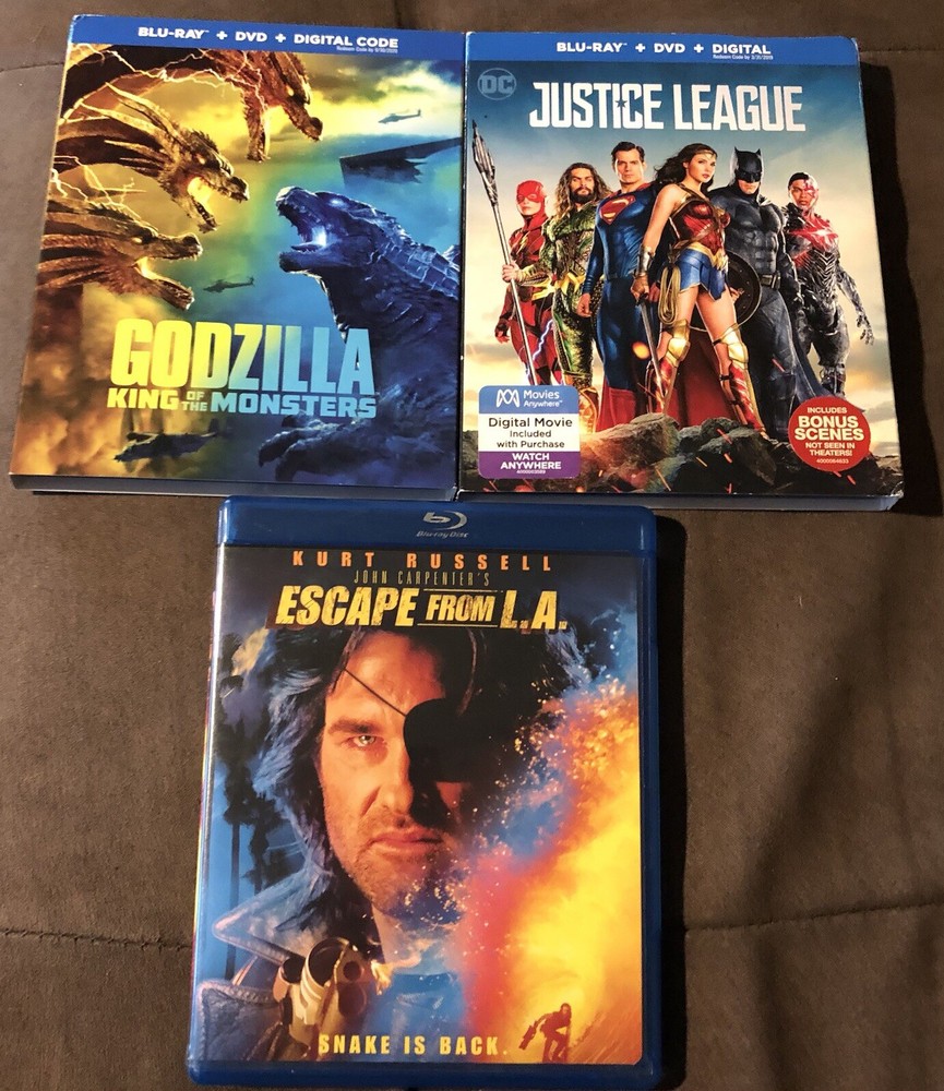 Titles: Godzilla King of the Monsters- 2019 - Blu-ray/DVD Combo pack Justice League- 2017 - Blu-ray/DVD Combo pack Escape From L.A. - 1996 - Blu-ray only Discs in good condition, some light danage to ...
