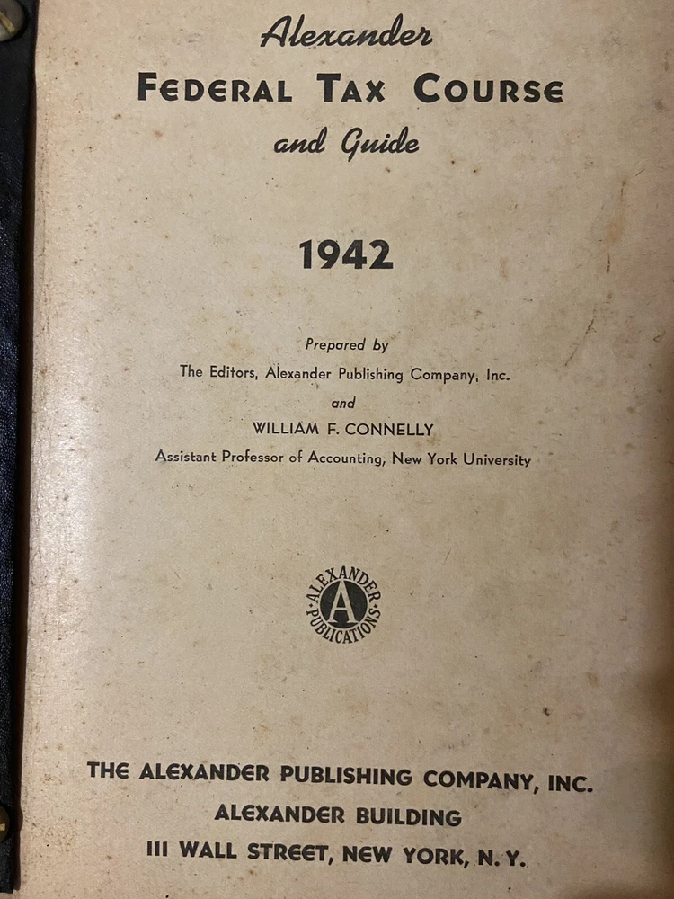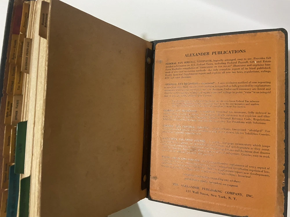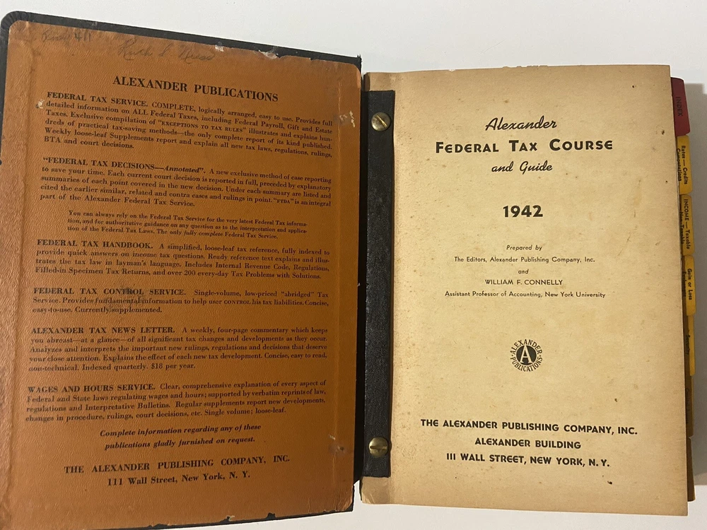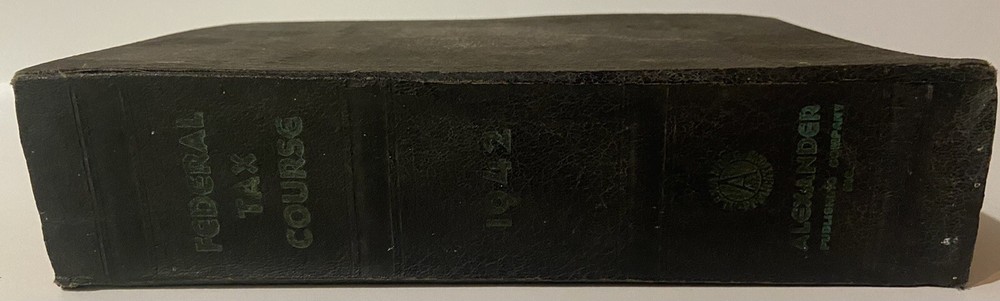 Alexander Federal Tax Course and Guide 1942 by William Connelly. An acceptable ring bound hardcover, no jacket issued. Heavy shelf wear and scuffing all throughout cover boards. Lite foxing to end papers and text block. Corners lightly bumped. Pages age toned. Ownership inscription on boards inner panel. Spine has heavy wear. Binding is fully in tact although well read and thoroughly used. Lite pencil notes on only one page. No edition stated, presumed 1st edition. Always shipped with care.