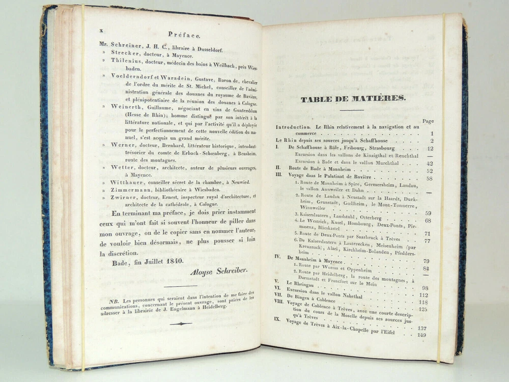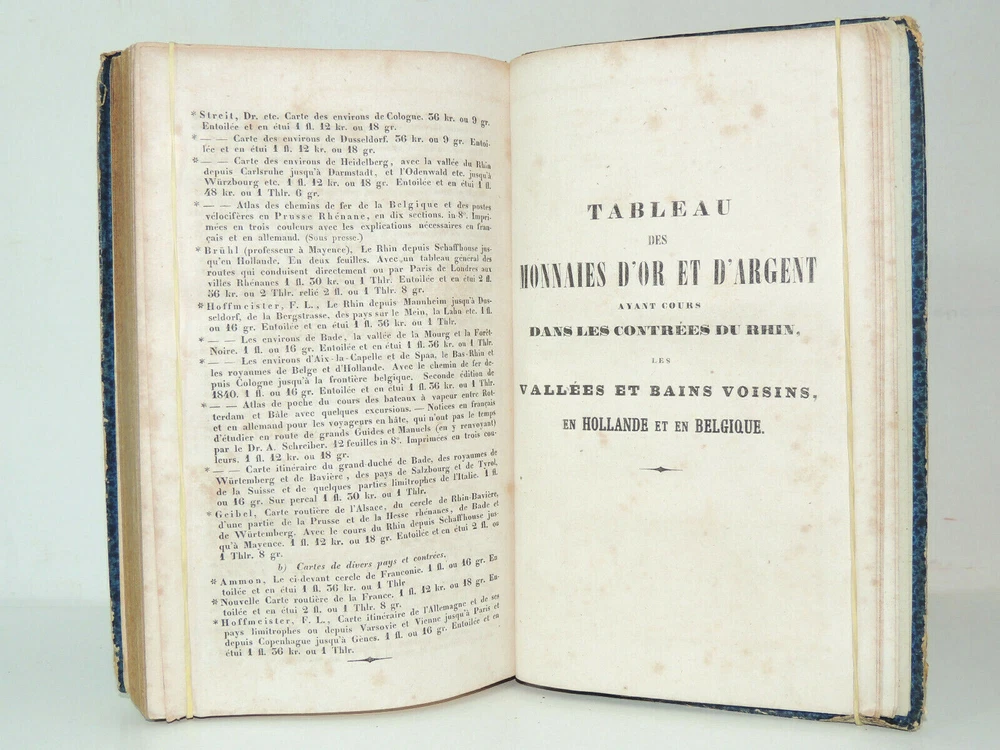 Aloyse Schreiber. Traveler's Guide, Lands of the Rhine, Holland, Belgium 1841 The description of this item has been automatically translated. If you have any questions, please feel free to contact us. The Rhine, guide for travelers in the regions of the Rhine, the neighboring valleys and baths, in Holland & Belgium by Aloyse Schreiber Table; the Rhine in relation to navigation and commerce - From Schaffhausen to Basel, Frigburg, Strasbourg, excursions in the valleys of Kinzighal & Renchthal - Road from Baden to Mannheim - Excursion to Baden - Travel in the Palatinate of Bavaria - From Mannheim to Mainz, road and mountain routes - The Rheingau - Excursion in the Nahethal Valley - From Bingen to Koblenz - Travel from Koblenz to Trier, with a description of the course of the Moselle from its sources to Trier - Travel from Trier to Aachen chapel by the Eifel - Bonn, Cologne, Dusseldorf - Travel to Belgium; Brussels, Antwerp.. - Trip to Holland; by the Drusus Canal, the Ysel River, Amsterdam, Ultrech, The Hague - Travel from Koblenz by the mineral waters of the Taunus to Friedberg and Gelnhausen.. - Navigation of the Rhine by steamboat. Fifth edition decorated with the portrait of the author, coin plates, no geographical maps announced, bound flight, in8, 18x13, half leather, rubbed corners, missing on the spine, very good interior condition, 413pp. rare. Heidelberg, at Joseph Engelmann, 1841 ref/240 Table; the Rhine in relation to navigation and commerce - From Schaffhausen to Basel, Frigburg, Strasbourg, excursions in the valleys of Kinzighal & Renchthal - Road from Baden to Mannheim - Excursion to Baden - Travel in the Palatinate of Bavaria - From Mannheim to Mainz, road and mountain routes - The Rheingau - Excursion in the Nahethal Valley - From Bingen to Koblenz - Travel from Koblenz to Trier, with a description of the course of the Moselle from its sources to Trier - Travel from Trier to Aachen chapel by the Eifel - Bonn, Cologne, Dusseldorf - Travel to Belgium; Brussels, Antwerp.. - Trip to Holland; by the Drusus Canal, the Ysel River, Amsterdam, Ultrech, The Hague - Travel from Koblenz by the mineral waters of the Taunus to Friedberg and Gelnhausen.. - Navigation of the Rhine b Reliure Cuir Caractéristiques spéciales Édition limitée Caractéristiques spéciales Illustré Langue Français Sujet Voyages et exploration Époque XIXème