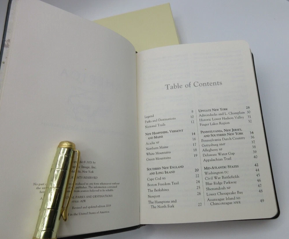 America: National Parks and Destinations Graphic Image published and bound in the United States Cover is bound in Calfskin leather This book was made exclusively for Orvis America is an atlas with a point of view. Focusing on leisure travel in the US, with an emphasis on national parks, this atlas features historic sites and American cultural destinations. This includes scenic highways, recreational areas, and historical locations like Route 66, Civil War battlefields and Antebellum home regions. There is a map offering a regional specialty for every state in the nation. Cream-white, acid-free paper with gilt edges - Double-faced cream ribbon marker - S myth sewn for strength and longevity - 320 pages INCLUDES INFORMATION ON: - National Parks and Trails, State Parks, National Forests - Important recreation and resort areas - Historic sites and most visited places in America - Noted regional sites (vineyards, horse farms, battlefields) - Outdoor destinations (family amusement centers, natural wonders, golf & ski centers, hiking trails) - U.S. travel distances - U.S. weather - Toll-free telephone numbers MAP SECTION INCLUDES: - 160 pages of full-color maps - Continental map - Regional driving and site specific maps Retail was $65.00 If you’re buying multiple items from us, we are happy to ship everything to you in the same package. eBay will automatically combine the shipping costs. Simply add your items to your shopping cart, and eBay will adjust the shipping cost at checkout.