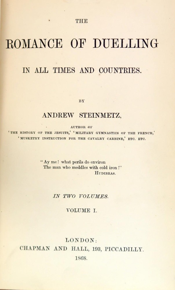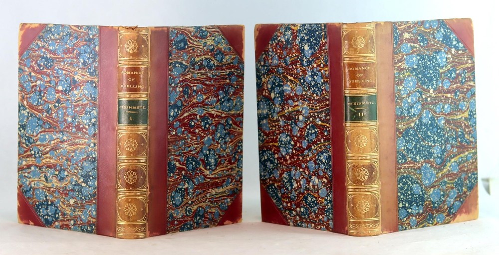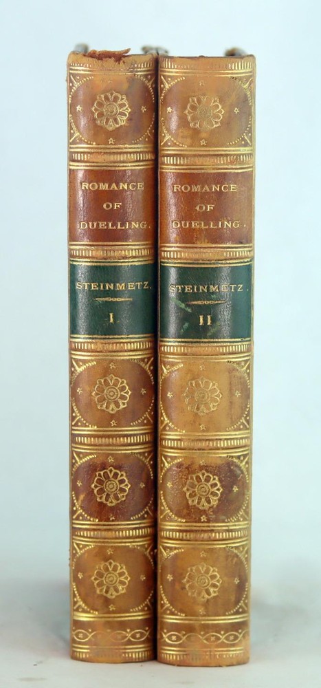 Leather. 8vo. Published by Chapman and Hall, London, UK. 1868. 2 Volumes. x, 336 pgs; viii, 384 pgs. Bound in 3/4 leather and mable paper covered boards with titles present to the spine and front board. Boards have light shelf-wear present to the extremities. No ownership marks present. Text is clean and free of marks. Binding tight and solid. History of duelling, particularly in Britain and France, but also Russia, America etc with recent examples outside Britain (where it had been banned for some time).These books provide an invaluable reference guide to the practice of duelling. Andrew Steinmetz Leather 1868 The Romance of Duelling in All Times & Countries Andrew Steinmetz Leather 1868 The Romance of Duelling in All Times & Countries Description Up For Sale Today is The Romance of Duelling in All Times and Countries by Andrew Steinmetz Leather. 8vo. Published by Chapman and Hall, London, UK. 1868. 2 Volumes. x, 336 pgs; viii, 384 pgs. Bound in 3/4 leather and mable paper covered boards with titles present to the spine and front board. Boards have light shelf-wear present to the extremities. No ownership marks present. Text is clean and free of marks. Binding tight and solid. History of duelling, particularly in Britain and France, but also Russia, America etc with recent examples outside Britain (where it had been banned for some time).These books provide an invaluable reference guide to the practice of duelling. OUR MISSION STATEMENT: Our goal is to provide the best books for the lowest prices. We understand that you have more choices than ever to buy books, so we strive to provide the best service, accurate descriptions, the cheapest shipping and the best customer service in the realm of bookselling. Thank you for visiting this listing and we hope to see you again soon! Book formats and corresponding sizes Name Abbreviations Leaves Pages Approximate cover size (width × height) inches cm folio 2º or fo 2 4 12 × 19 30.5 × 48 quarto 4º or 4to 4 8 9½ × 12 24 × 30.5 octavo 8º or 8vo 8 16 6 × 9 15 × 23 duodecimo or twelvemo 12º or 12mo 12 24 5 × 7⅜ 12.5 × 19 sextodecimo or sixteenmo 16º or 16mo 16 32 4 × 6¾ 10 × 17 octodecimo or eighteenmo 18º or 18mo 18 36 4 × 6½ 10 × 16.5 trigesimo-secundo or thirty-twomo 32º or 32mo 32 64 3½ × 5½ 9 × 14 quadragesimo-octavo or forty-eightmo 48º or 48mo 48 96 2½ × 4 6.5 × 10 sexagesimo-quarto or sixty-fourmo 64º or 64mo 64 128 2 × 3 5 × 7.5 ALL ITEMS ARE DESCRIBED TO THE BEST OF MY ABILITY! PLEASE CHECK ALL THE PHOTOS BEFORE BIDDING! PAYMENT IS DUE WITHIN FOUR (4) DAYS OF THE INVOICE! Import duties, taxes and charges are not included in the item price. These charges are the buyer's responsibility. Please check with your country's customs office to determine what these additional costs will be prior to bidding/buying. These charges are typically collected by the delivering freight (shipping) company or when you pick the item up. We do not mark merchandise values below value or mark items as "gifts" as US and International government regulations prohibit such behavior. (This is a felony in the United States) 300+ Listing Templates! Auctiva gets you noticed! The complete eBay Selling Solution. Track Page Views With Auctiva's Counter