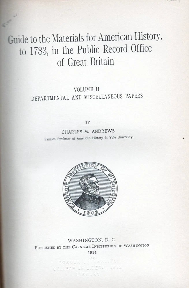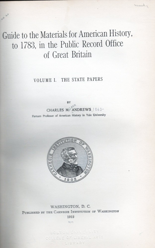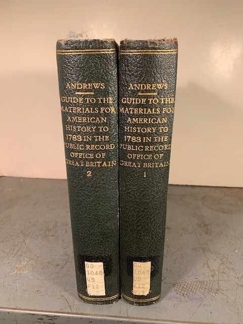 Volumes one and two of Guide to the Materials for American History to 1783, in the Public Record Office of Great Britain. Volume One is State Papers and Volume Two is Departmental and Miscellaneous Papers. Nice leather bound books which list early American documents held by the Public Record Office of Great Britain which covers things such as treasury records, farming, naval, various state records, Admiralty papers, audit records, Indian affairs and other such early colonial records. Media mail shipping.
