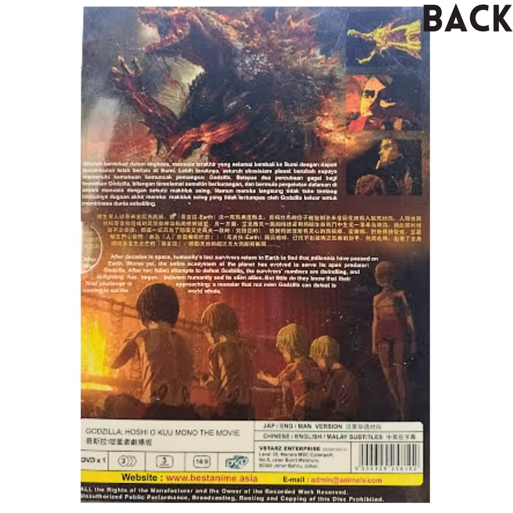 DVD Anime Godzilla The Movie 3: Hoshi O Kuu Mono (2019) Product Description : Condition: NEW, Original & Licensed Item Language: Japanese/English/Mandarin Subtitle: English/Chinese/Malay Media Type: NTSC; Widescreen16:9, All Region Production: 2019 No. of Disc: 1 DVD Synopsis : A door opens, and a golden seal shatters a star. It is the early 21st century. Mankind has lost the battle for planet Earth to Godzilla, and has taken to the stars in search of a new home. But the search ends in vain, forcing them and their alien allies back to Earth. But 20,000 years have passed in their absence, and the Earth is a wholly different place. The planet's flora and fauna now embody and serve Godzilla. Earth is a monster's planet, ruled by the largest Godzilla ever at 300 meters in height. Godzilla Earth. Human protagonist, Captain Haruo, yearns to defeat Godzilla and retake the planet for mankind. There, he meets aboriginal descendants of the human race, the Houtua tribe. The Houtua twin sisters, Maina and Miana, lead him to the skeletal remains of Mecha-Godzilla, an old anti-Godzilla weapon, which to everyone's surprise is still alive in the form of self-generating nanometal. Taken from the Mecha-Godzilla carcass, the nanometals have gradually been rebuilding a "Mecha-Godzilla City," a potential weapon capable of destroying Godzilla Earth. As the strategy develops, a rift forms between the humans and the Bilusaludo, one of several alien races that had joined the humans on their exodus from Earth. Their leader, Galu-gu, believes that the secret to defeating Godzilla lies in the use of superhuman powers – namely, the nanometal integration – but Haruo resists, fearing that in defeating monsters, they must not become monsters themselves. Haruo ultimately uses his means for defeating Godzilla Earth to destroy the Mecha-Godzilla city so as to prevent nanometal assimilation, killing Galu-gu. However, his childhood friend, Yuuko, has been absorbed by the nanometal integration and has fallen into a brain dead coma. The human race, once again, is lost. Metphies, commander of the priestly alien race, Exif, marvels at the miraculous survival of Haruo, he begins to attract a following. The Exif has secretly harbored this outcome as their "ultimate goal." Miana and Maina issue warnings against Metphies, while Haruo begins to question mankind's next move. With no means for defeating Godzilla Earth, mankind watches as King Ghidorah, clad in a golden light, descends on the planet. The earth shakes once again with as war moves to a higher dimension. What is Godzilla exactly? Does mankind stand a chance? Is there a future vision in Haruo's eyes? Find out in the finale. FREE Shipping Outside US : International Economy Shipping (11 - 23 Business Days)