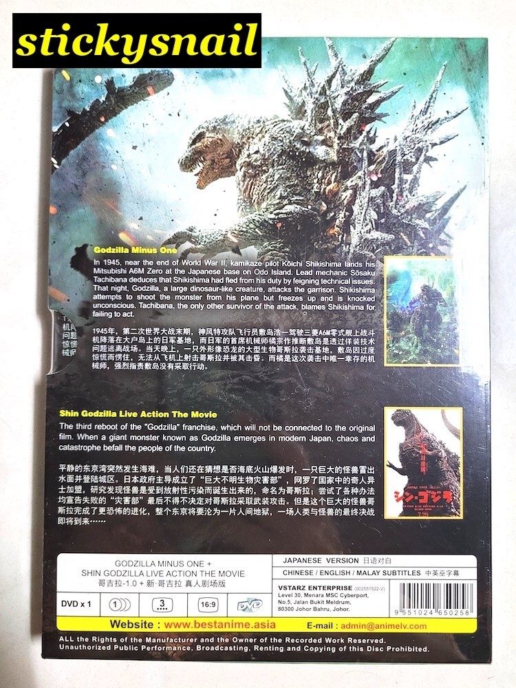 !!! FREE INTERNATIONAL SHIPPING !!! ** Brand New Sealed. ** Your order will be shipped within one day after payment confirmed. Japanese Anime DVD: Godzilla Minus One + Shin Godzilla Live Action The Movie Language: Japanese Subtitle: English/Chinese Media Type: NTSC; Widescreen 16:9, All Region No of CDs: 1 DVD Godzilla Minus One +哥吉拉-1.0 In 1945, near the end of World War II, kamikaze pilot Kōichi Shikishima lands his Mitsubishi A6M Zero at the Japanese base on Odo Island. Lead mechanic Sōsaku Tachibana deduces that Shikishima had fled from his duty by feigning technical issues. That night, Godzilla, a large dinosaur-like creature, attacks the garrison. Shikishima attempts to shoot the monster from his plane but freezes up and is knocked unconscious. Tachibana, the only other survivor of the attack, blames Shikishima for failing to act. Shin Godzilla Live Action The Movie The third reboot of the "Godzilla" franchise, which will not be connected to the original film. When a giant monster known as Godzilla emerges in modern Japan, chaos and catastrophe befall the people of the country. Payment & Shipping: Item will be processed and ship within 1 working day (not included weekend or public holiday). Tracking number will be provided. As the seller, we are not liable for any extra cost/ charge/ tax imposed by your custom upon receiving the package. Item should reach to your doorstep within 14-30 working days, subject to locations and custom clearance. Return Policy: All sales are FINAL and Non-negotiable. Items can be returned to exchange within 14 days. The buyer is responsible for return shipping cost. Before we ship the item, we will do a final check to make sure the item is in undamaged condition. Thus, we won't bear any responsibility for any item damaged during shipping. If the item is missing in the transit, we will refund 100% to the buyer. If buyer have received the incorrect item, please contact us as soon as possible. Please provide picture's which incorrect item status can be clearly shown. We will resolve the problem quickly and after confirm, we will replace the correct item to buyer as soon as possible. Buyer return incorrect item to me must use "Registered Airmail" with tracking number so both parties can trace the parcel status. About Left or Leaving Feedback: Please contact me to resolve any bad issue before leaving neutral or negative feedback. Thank you for your business!