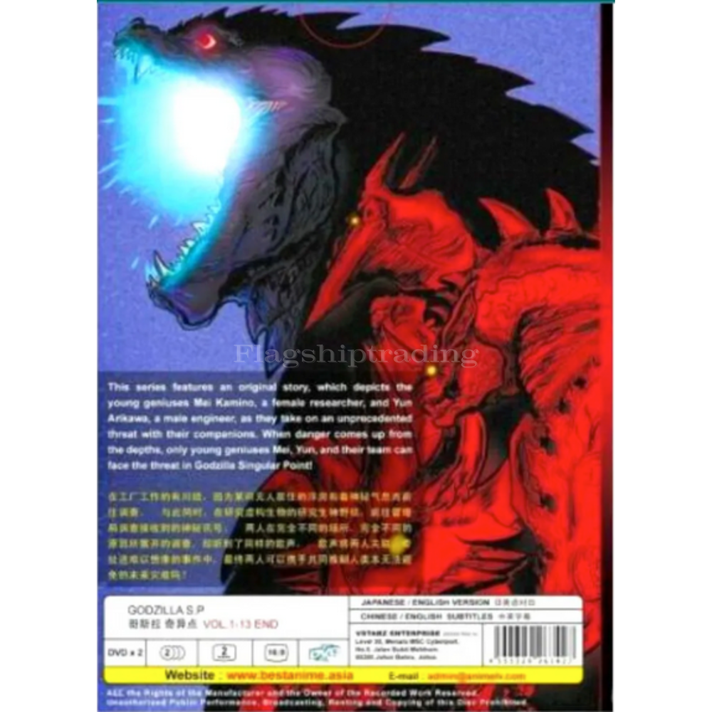 Created with Eselt - Responsive Templates for eBay Sellers Give us a call Send us a message Created with Eselt - Responsive Templates for eBay Sellers Our Store Seller Profile Feedback About us Contact Anime DVD Godzilla S.P/Singular Point Complete TV Series (1-13 End) PRODUCT INFORMATION: Title : Godzilla S.P/Singular Point Numbers of episode : 1 - 13 (End) Numbers of discs : 2 Language : Japanese / English Subtitles : English / Chinese Format : ALL Region Condition : NEW, Original & Licensed Item STORYLINE: This series features an original story, which depicts the young geniuses Mei Kamino, a female researcher, and Yun Arikawa, a male engineer, as they take on an unprecedented threat with their companions. When danger comes up from the depths, only young geniuses Mei, Yun, and their team can face the threat in Godzilla Singular Point! Payment Currently, we accept payment through eBay-managed payment. Shipping We are using standard shipping from the USA. Handling time is 1-3 working days. Your goods will be shipped with a valid tracking number. All products are packed, and layered with bubble wrap to reduce damages during shipment delivery. Estimate delivery is between 4 to 7 business days. Returns If you have any problem with the order, do contact us via eBay message. we are glad to assist you and solve the problem as soon as possible. Items can be returned within 30 days in a good condition. Other Note: Import duties, taxes, and additional charges are not included in the item price or shipping charges. Please be aware this custom import duties and taxes are buyer's responsibility Links Our Store Seller Profile Feedback About us Contact More items Are you looking for something similar? See our other items! Show more items Contact Give us a call Send us a message Created with Eselt - Responsive Templates for eBay Sellers