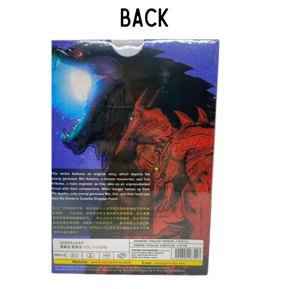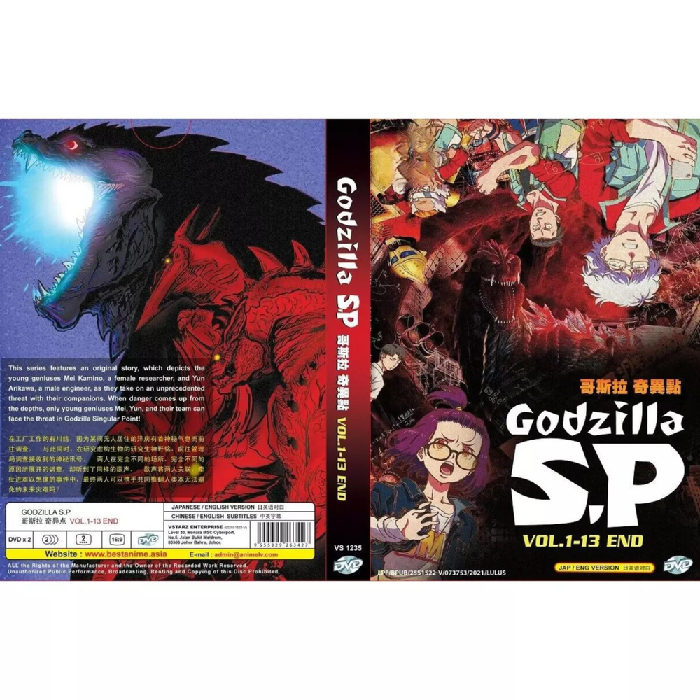 DVD Anime Godzilla Singular Point (s.p) Vol 1-13 End ANIME TV SERIES Complete TV Series Product Description : Language: Japanese/ English Condition:NEW, Original & Licensed Item Subtitle: English/ Chinese Number of Episodes: Vol. 1-13 End Number of Discs: 2 Region Code: ALL Region, Region FREE "0" (Able to play on DVD Players throughout the World) Synopsis: This series features an original story, which depicts the young geniuses Mei Kamino, a female researcher, and Yun Arikawa, a male engineer, as they take on an unprecedented threat with their companions. When danger comes up from the depths, only young geniuses Mei, Yun, and their team can face the threat in Godzilla Singular Point! FREE Shipping Outside US : International Economy Shipping (11 - 23 Business Days)