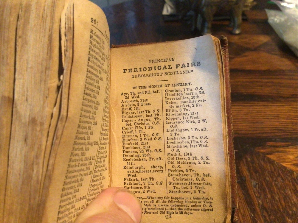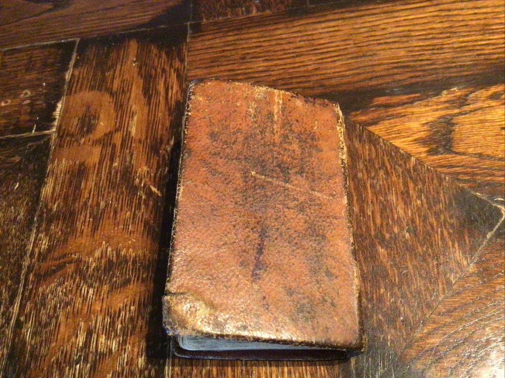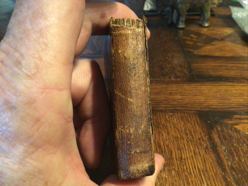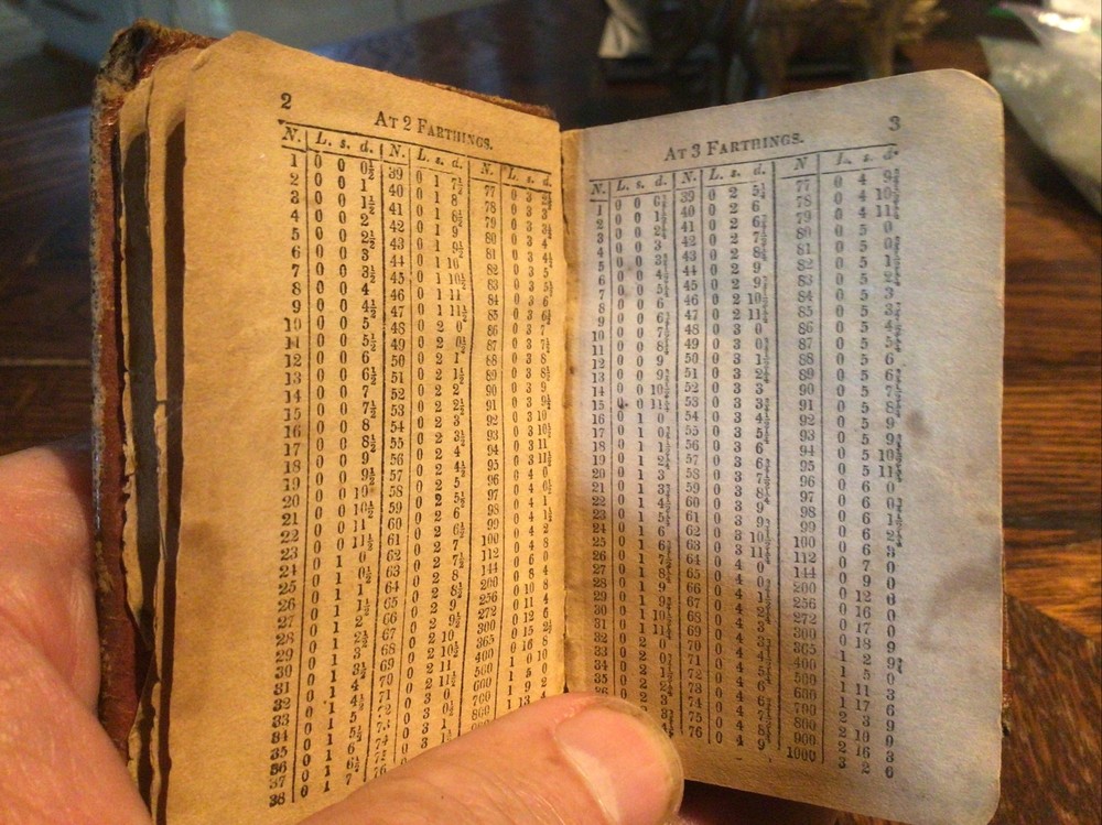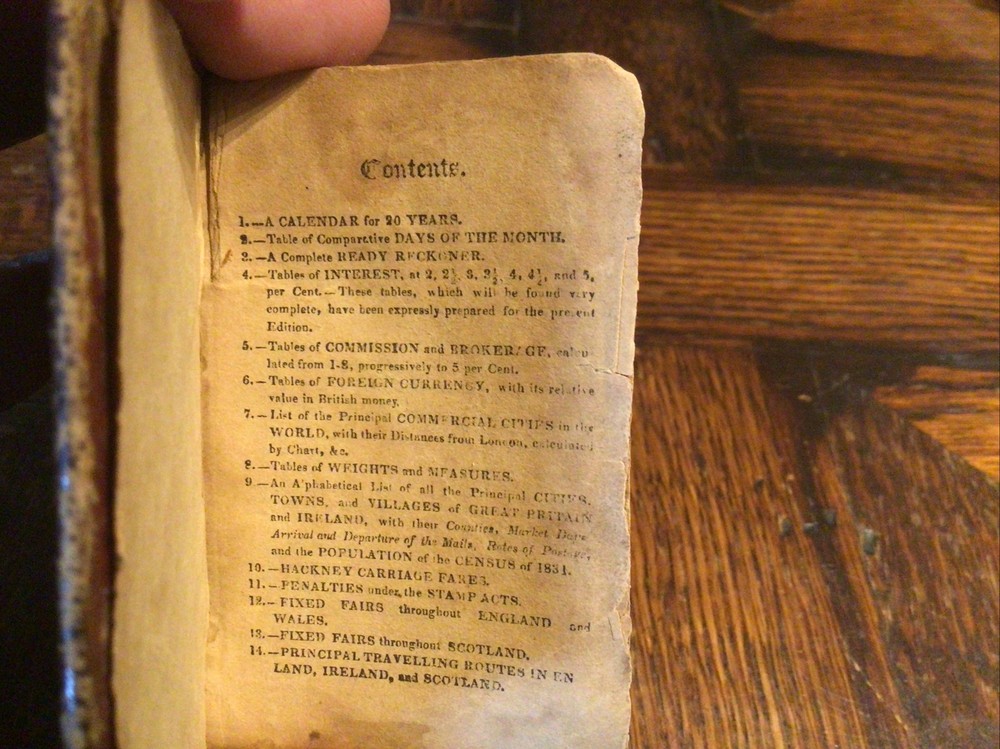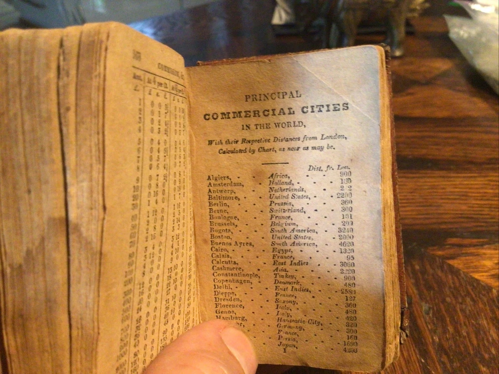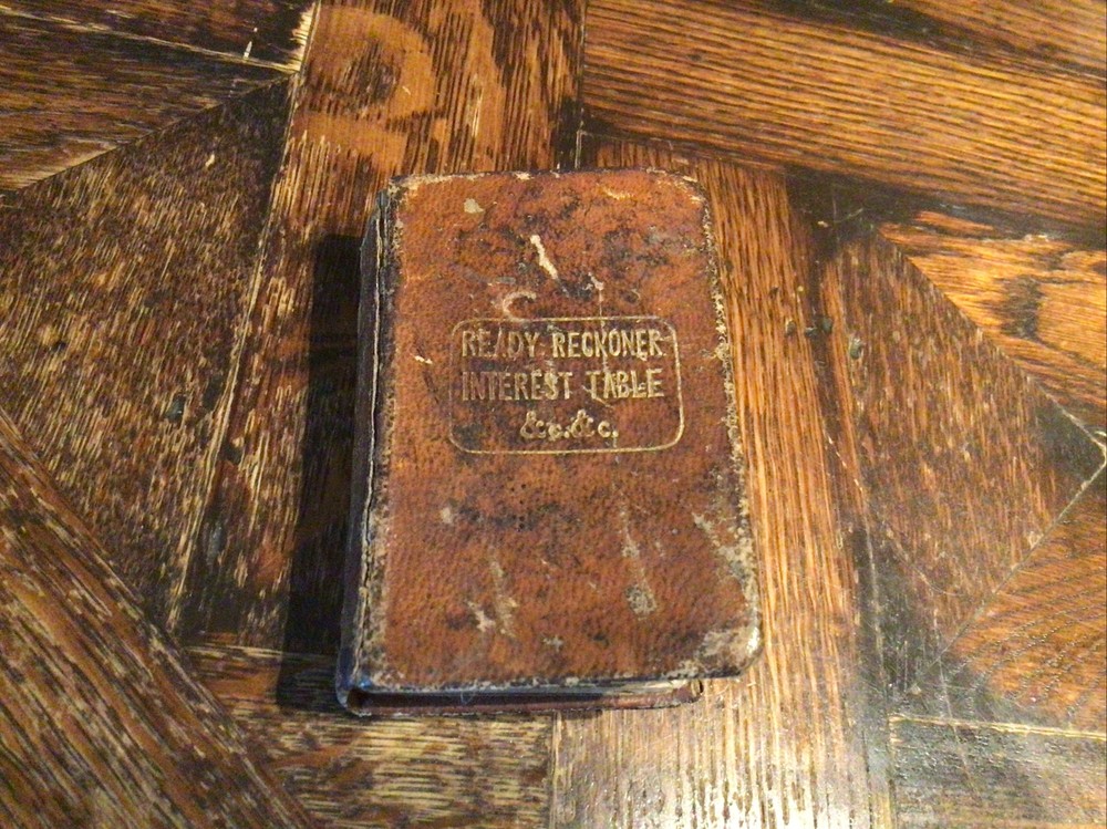 Antique miniature leather bound English book “Ready Reckoner Interest Table”, has wear and missing end papers generally complete, measures aprox. 2” x 3 1/4”.