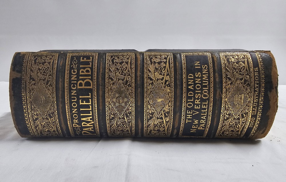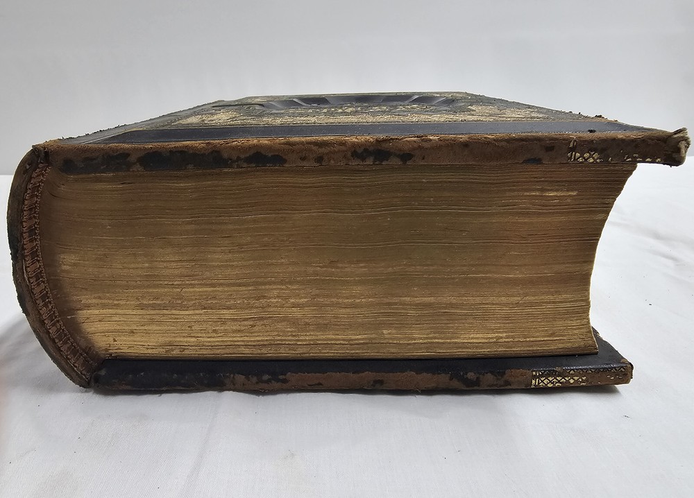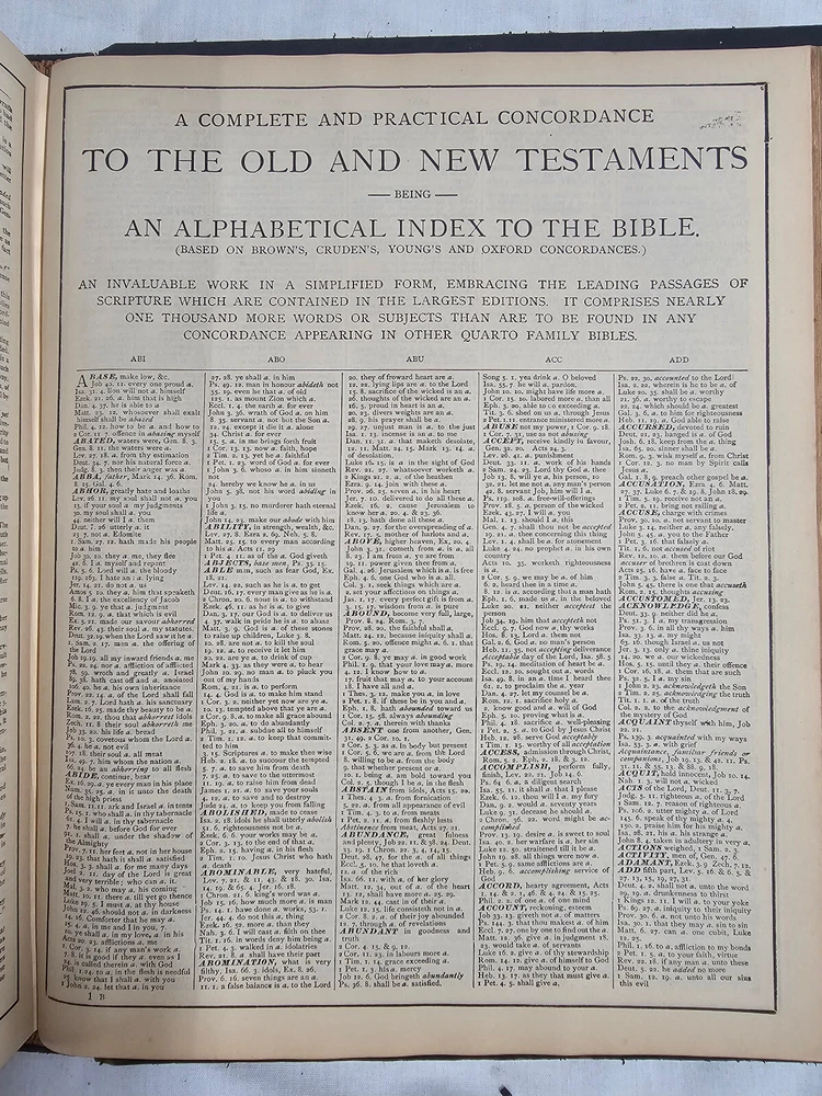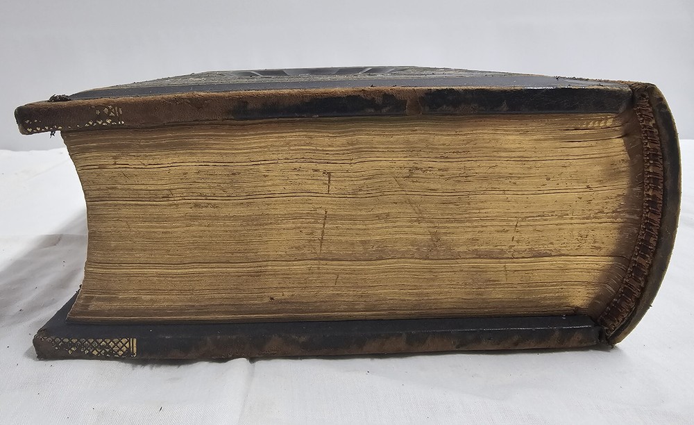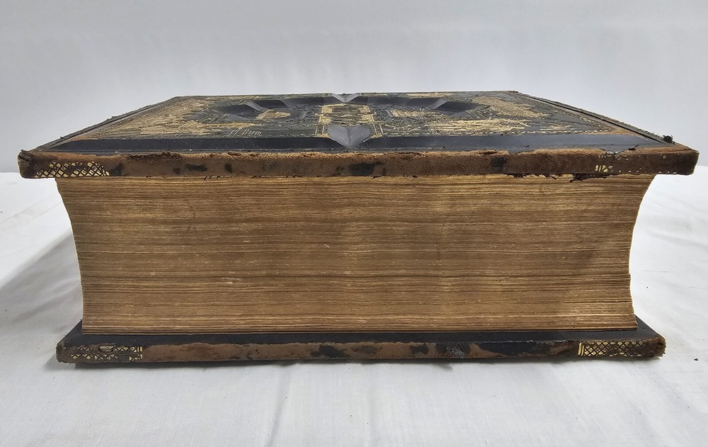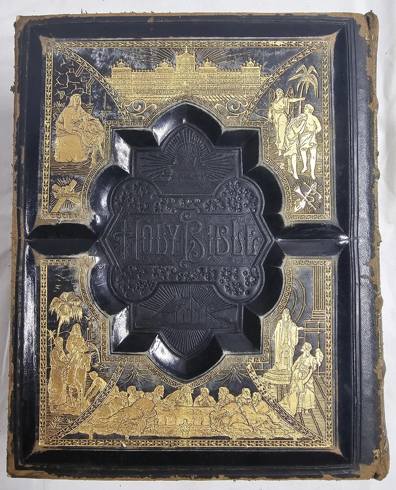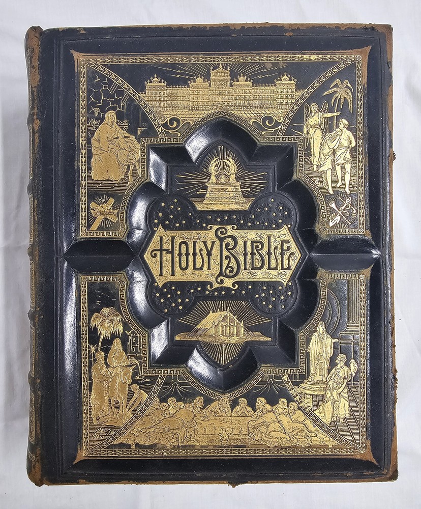CONDITION: Please see the photos. Aged but intact. Penciled in notes as shown in the photos. The finish, or outer layer, of the thick leather binding is "flaking" off. All of the family pages are filled, or written, in. Bible measures approximately: 12 1/4" x 10 1/2" x 4 1/2" thick. This huge BIble not only contains the old and new testaments. It has numerous reference and study pages including: - HISTORY OF THE TRANSLATION OF THE ENGLISH BIBLE - HISTORY OF THE RELIGIOUS DENOMINATIONS OF THE WORLD - NUMEROUS MAPS - NUMEROUS ILLUSTRATIONS - BIOGRAPHICAL SKETCHES OF THE TRANSLATORS, REFORMERS & MARTYRS - HISTORY OF THE BOOKS OF THE BIBLE - DESCRIPTIONS OF IMPORTANT STRUCTURES (i.e. The Tabernacle in the Wilderness, Temples of Solomon & Herod) - THE BOOKS OF THE NEW TESTAMENT WITH AUTHORSHIP & DATES - ILLUSTRATIONS AND DESCRIPTIONS OF ANCIENT MONEY - HOUSEHOLD DICTIONARY OF THE BIBLE - FAMILY PAGES (ALL WRITTEN IN) - SCENES & INCIDENTS IN THE LIFE OF OUR LORD - A COMPLETE & PRACTICAL CONCORDANCE TO THE OLD & NEW TESTAMENTS - A CHRONOLOGICAL INDEX TO THE HOLY BIBLE - FOUR THOUSAND QUESTIONS AND ANSWERS ON THE NEW & OLD TESTAMENTS Please feel free to email with any questions prior to bidding or buying. I try to give any information I have about the listings, and to tell you whether the information is fact or opinion. I have a "full refund option" (see returns below) policy for anything I misrepresent. My description will point out anything I find that could possibly be considered a flaw. For this reason, many past buyers felt that they received a better product than they expected. DOMESTIC SHIPPING CHARGES: Larger packages will have the option of 3 ground carriers. Priority mail is offered on smaller, more economical, packages. I use padded envelopes, peanuts, bubble wrap, and Styrofoam packaging as necessary to ensure safe arrival. Free local pick up in, or possibly near, Williston, FL is an option. If you live on the west coast please allow that transit time and costs will be more than average from Florida. I'm happy to combine multiple purchases, paid for at the same time, into one package to save on shipping. CUSTOMER SERVICE: Once you examine your purchase, please message, or leave positive feedback, to confirm receipt and satisfaction. If you encounter any problem with your service or product, I ask that you contact me, via eBay, so that I have the opportunity to resolve the issue. FEEDBACK: Automatic feedback is left after your purchase. Once you have received your purchase, please consider leaving me the best feedback possible. If my service or product did not meet your expectations in any way please contact me. Mimi's E-Treasures Welcome to my listing. Quite simply, my goal is to make an honest living and have fun at the same time. I strive to provide reasonable prices and excellent service. I invite you to browse my store and auction listings often to find an eclectic mix of items from local estates. May your day be filled with sunshine!