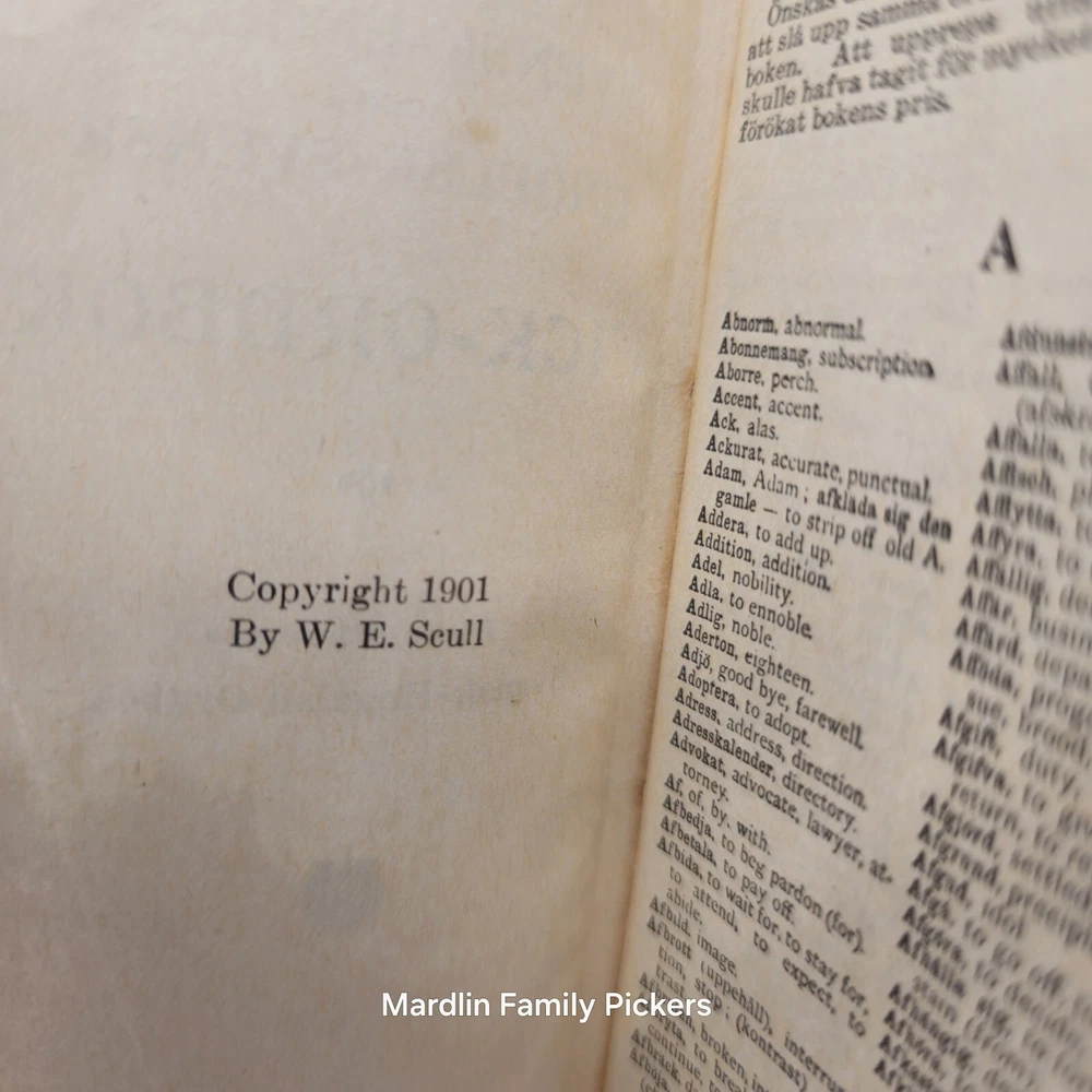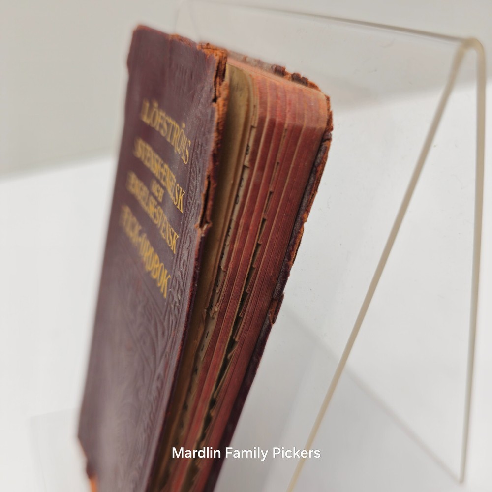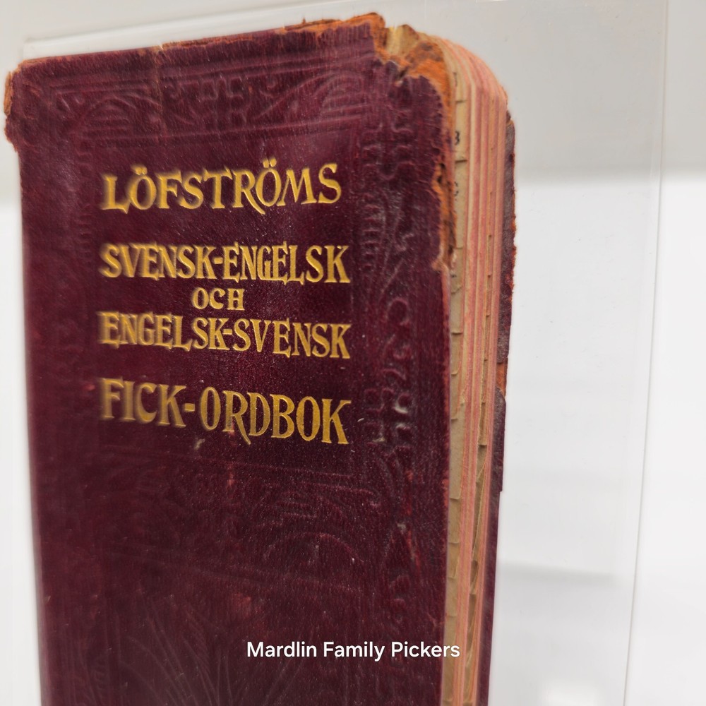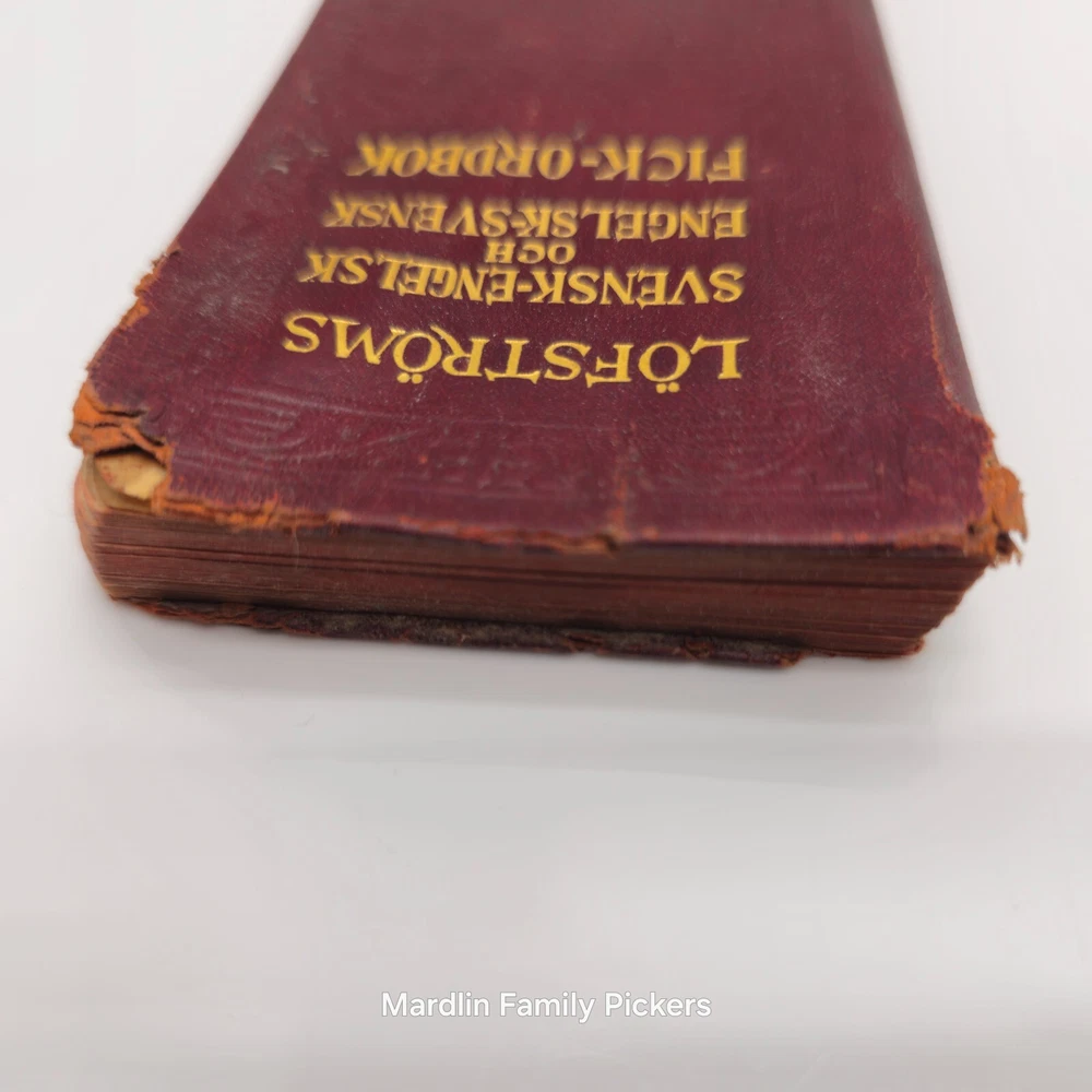 This is an antique 1901 edition of Löfströms Svensk-Engelsk och Engelsk-Svensk Fick-Ordbok (Swedish-English and English-Swedish Pocket Dictionary), copyright by W. E. Scull. Condition: Antique used condition. The embossed red cover shows significant wear, rubbing, fraying, and loss, particularly at corners and spine ends. Gilt title on cover is partially visible. Gilt page edges are worn. Contains a pencil ownership inscription from Harvey Johnson of Rapid City, Michigan, on a front flyleaf. Interior pages are tanned. The binding is worn. Item Details: Title: Löfströms Svensk-Engelsk och Engelsk-Svensk Fick-Ordbok Copyright: W. E. Scull Year: 1901 Language: Swedish-English / English-Swedish Type: Pocket Dictionary Binding: Embossed Flexible/Semi-Flexible Hardcover Visit the Mardlin Family Pickers store for unique finds! We ship orders the next day (Our Shipping Days: M, W T F S, excluding holidays).