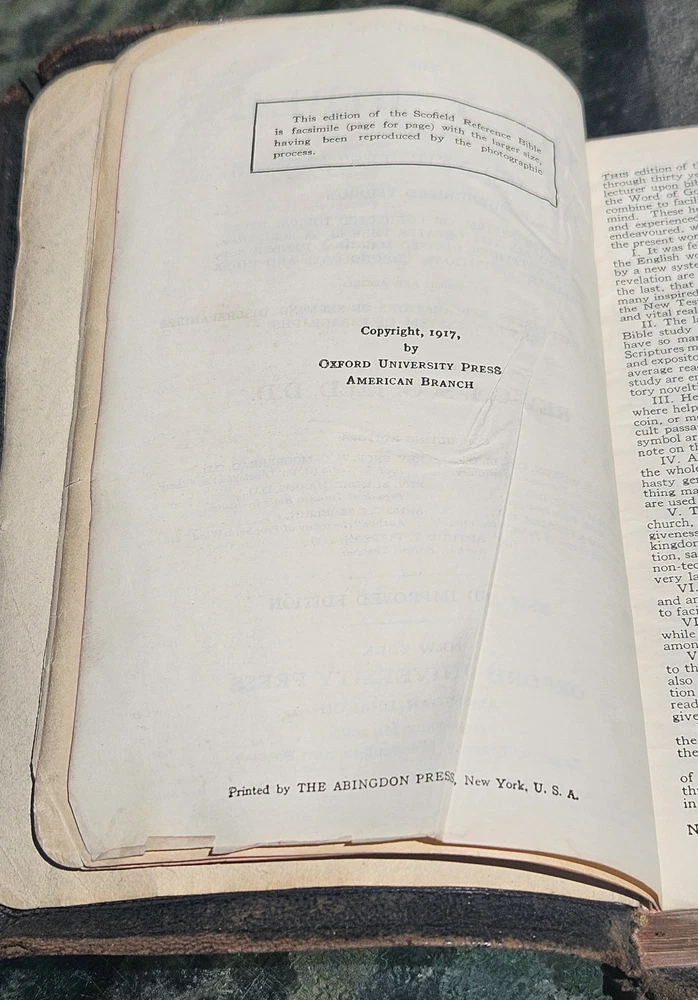 Listing includes 1 Antique 1917 Oxford Holy Bible Scofield Reference bound in Leather Moroccan Goatskin. Good condition. The leather has some fragility and wear and tear due to age. The inside pages have some creases in them, but are in overall excellent condition for the age of this item. Measurements included in pictures. Please review the pictures carefully and let me know if there are any questions. Thank you!