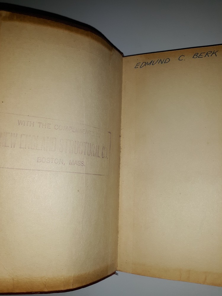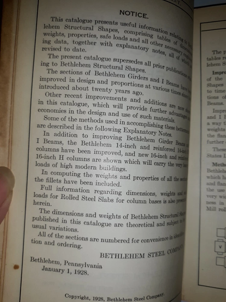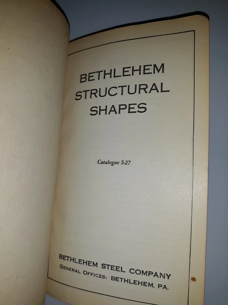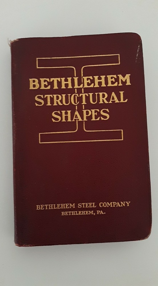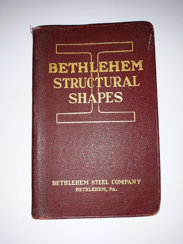 Bethlehem Structural Shapes Guide Book. First edition? January 1928. Good condition. Fray on top and bottom of binder but over all pretty good condition for the age. Leather bound? Stamped and someone's name inside first page.