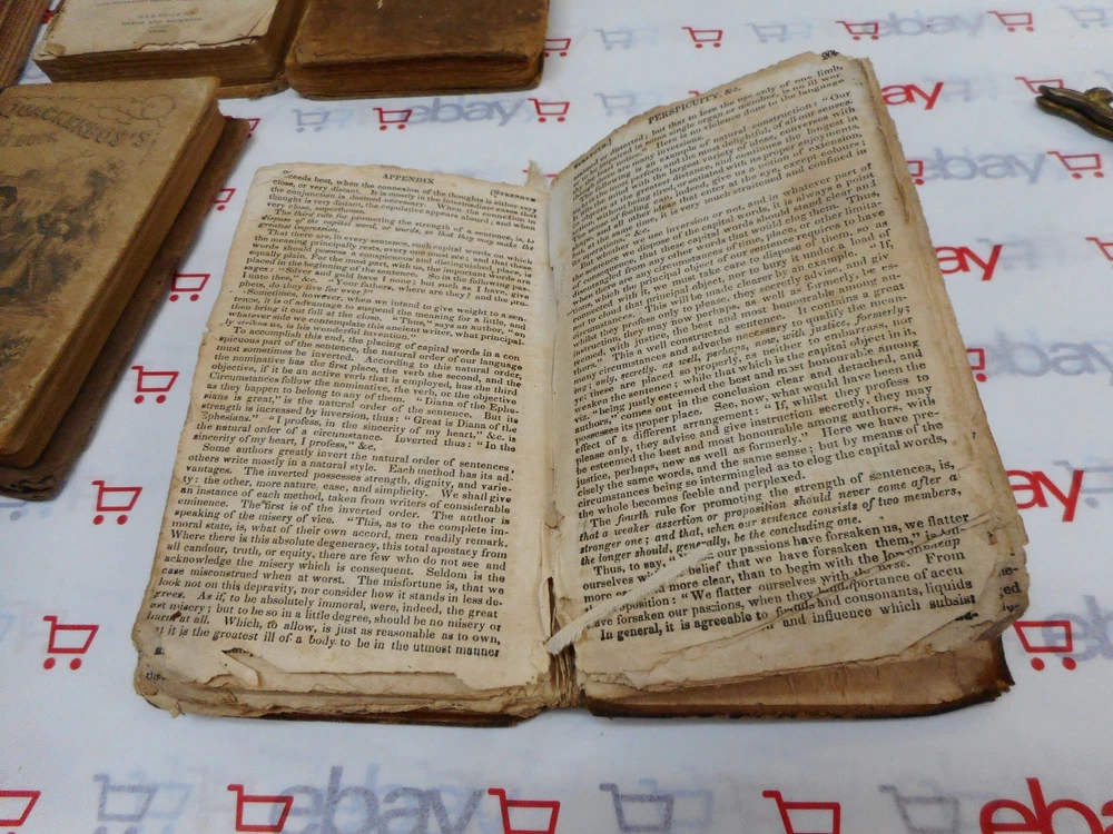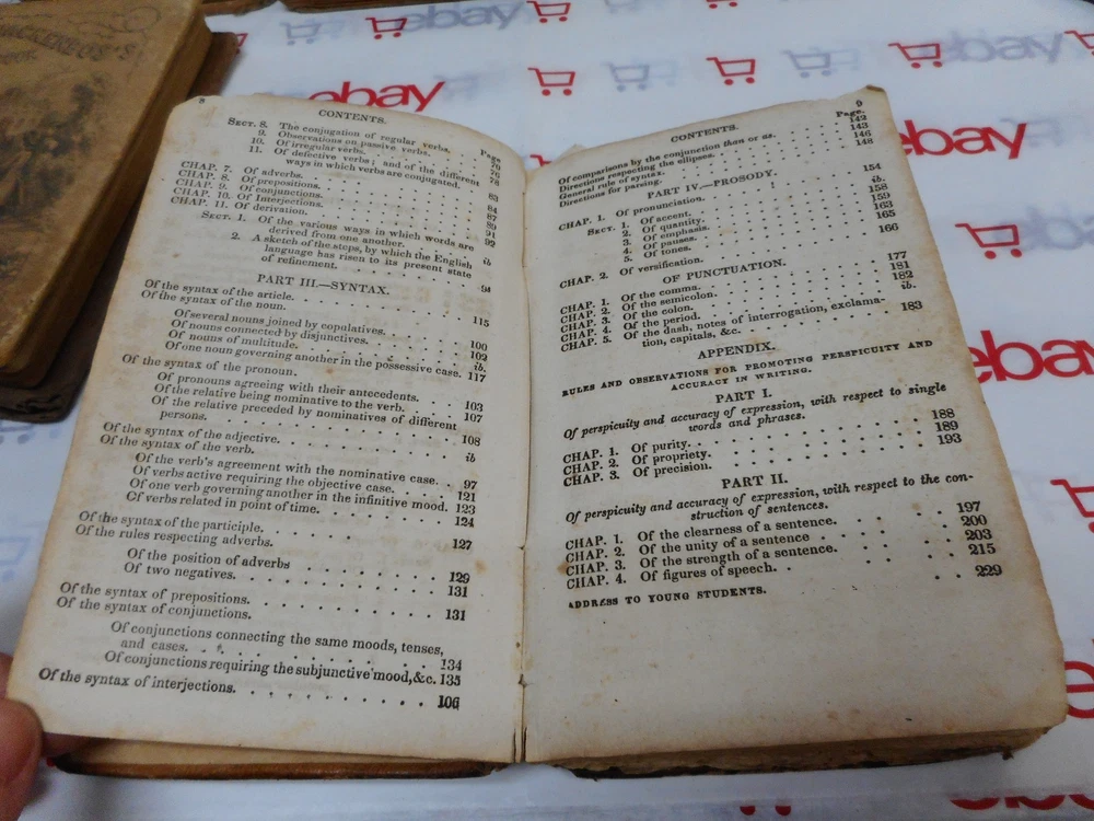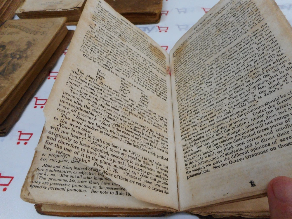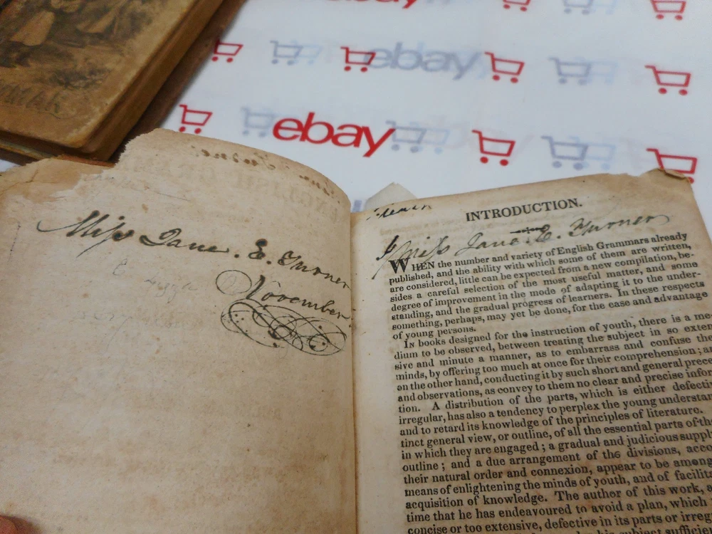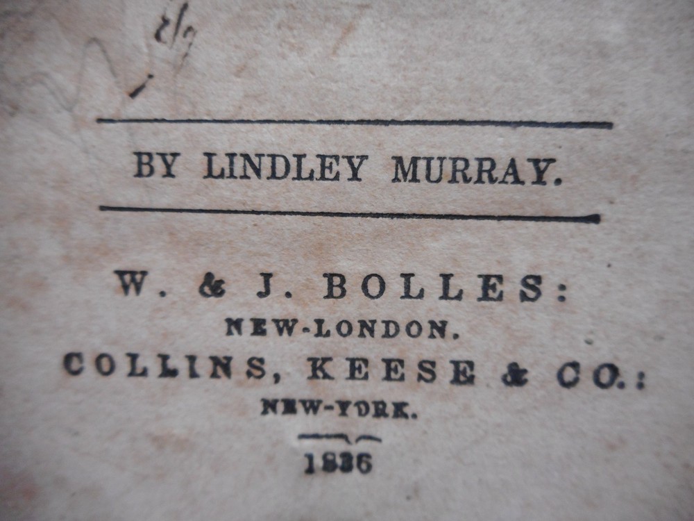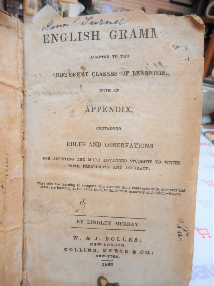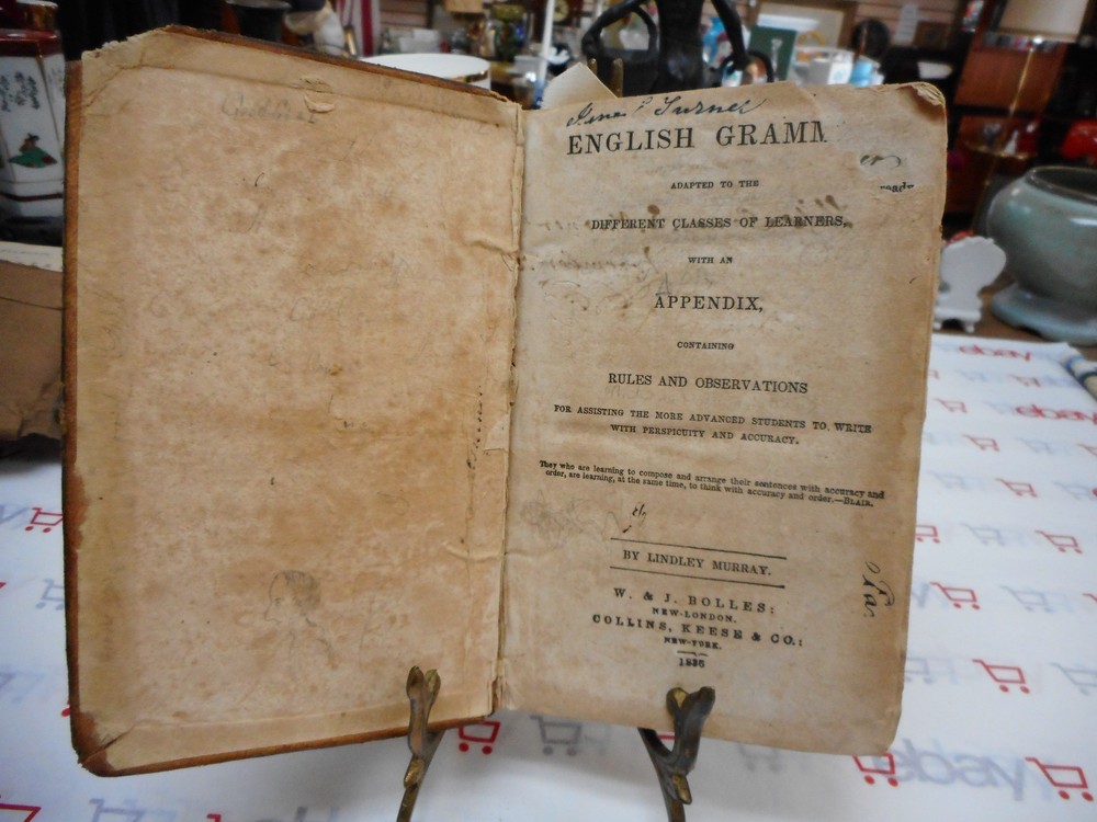 English Grammar Book by Lindley Murray Published in 1836 W. J. Bolles: New-London Collins, Keese & Co.: New-York 4 1/4" X 6 3/4" leather bound Please see all pictures, leather corner tear, some bottom of pages torn, some writing in book- Name: --- Jane Turner, who was married to Wm. Robinson, a family known for tobacco, B & O railroad, and politics in the 1800's in Prince George's County in Brandywine, Md, of course wear on/in book, it is 182 years old!! **This is just the beginning of some very RARE books from the 1800's I will be listing in the next few weeks from Prince George's County Brandywine, MD, & Washington D.C. area *consignor*shr