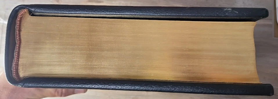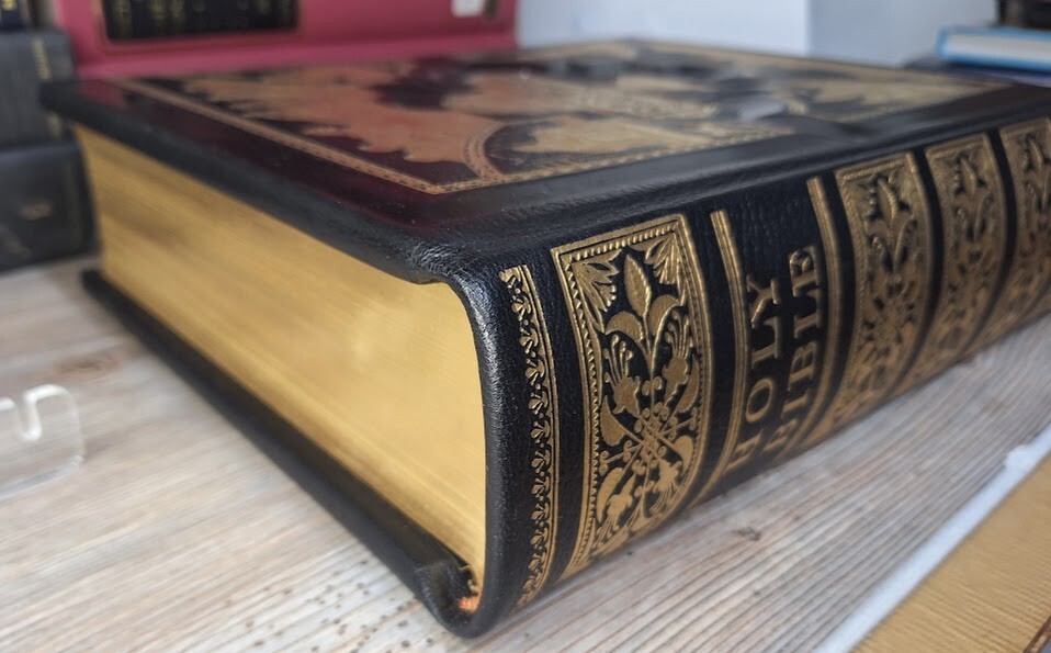 Rare antique Holy Bible in richly embossed black leather with gold leaf highlights and raised cover scenes, likely late 19th century. Features include ornate spine, gilt page edges, and family record pages inside. A stunning collector’s piece perfect for display or restoration. No ISBN typical of books from this era. Excellent candidate for religious collectors or Victorian-era home décor.