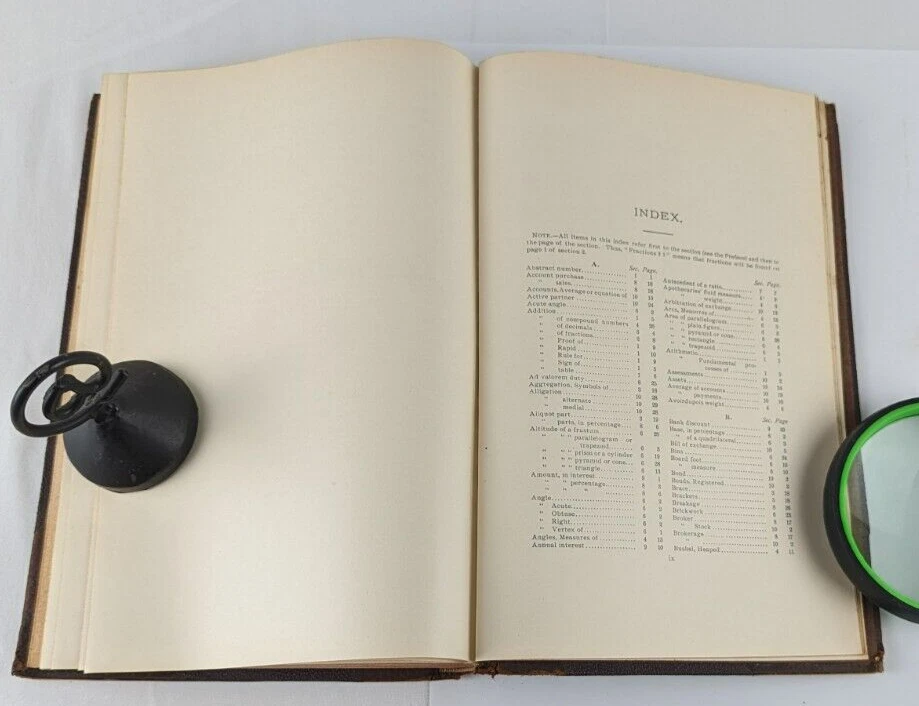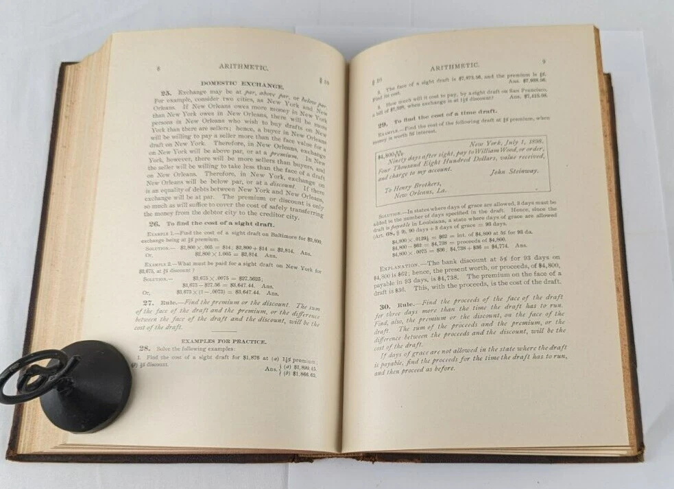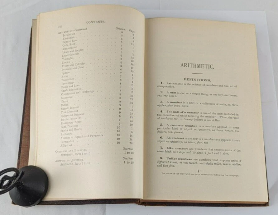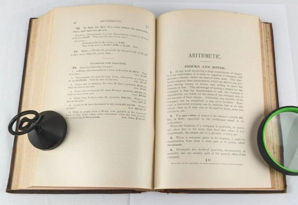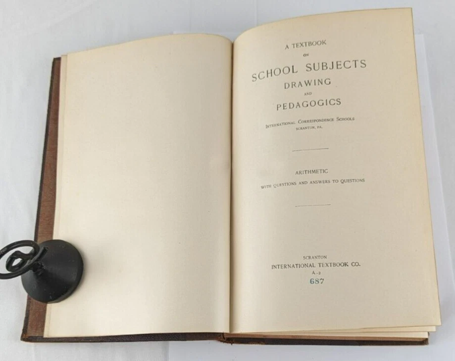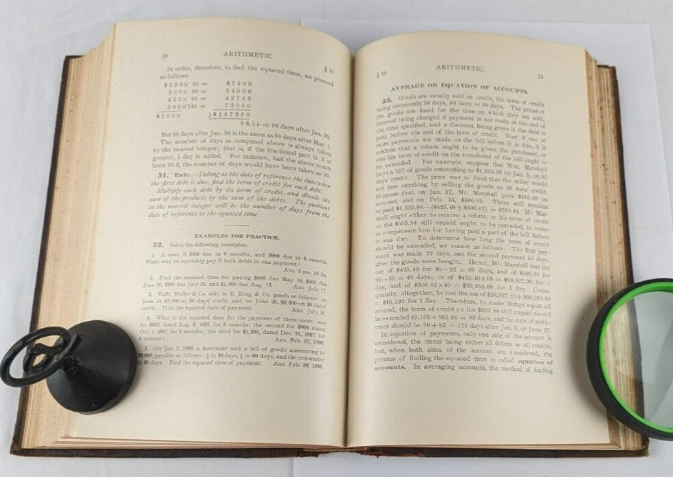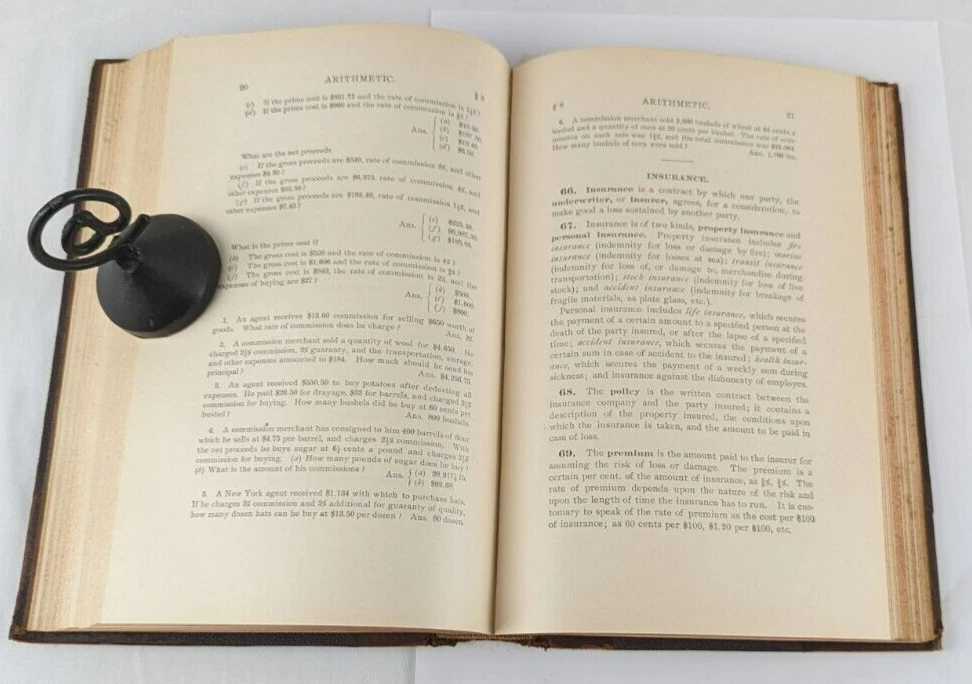 This antique math textbook from 1902 covers topics such as arithmetic, as well as accounting, investment, interest, and insurance calculations. The partial leather-bound book was published by International Textbook Company in Scranton PA, United States. It is a great addition to any collection of antiquarian and collectible books. The book's subject matter is arithmetics and it is relevant to anyone interested in the history of mathematics. The year printed is clearly indicated.